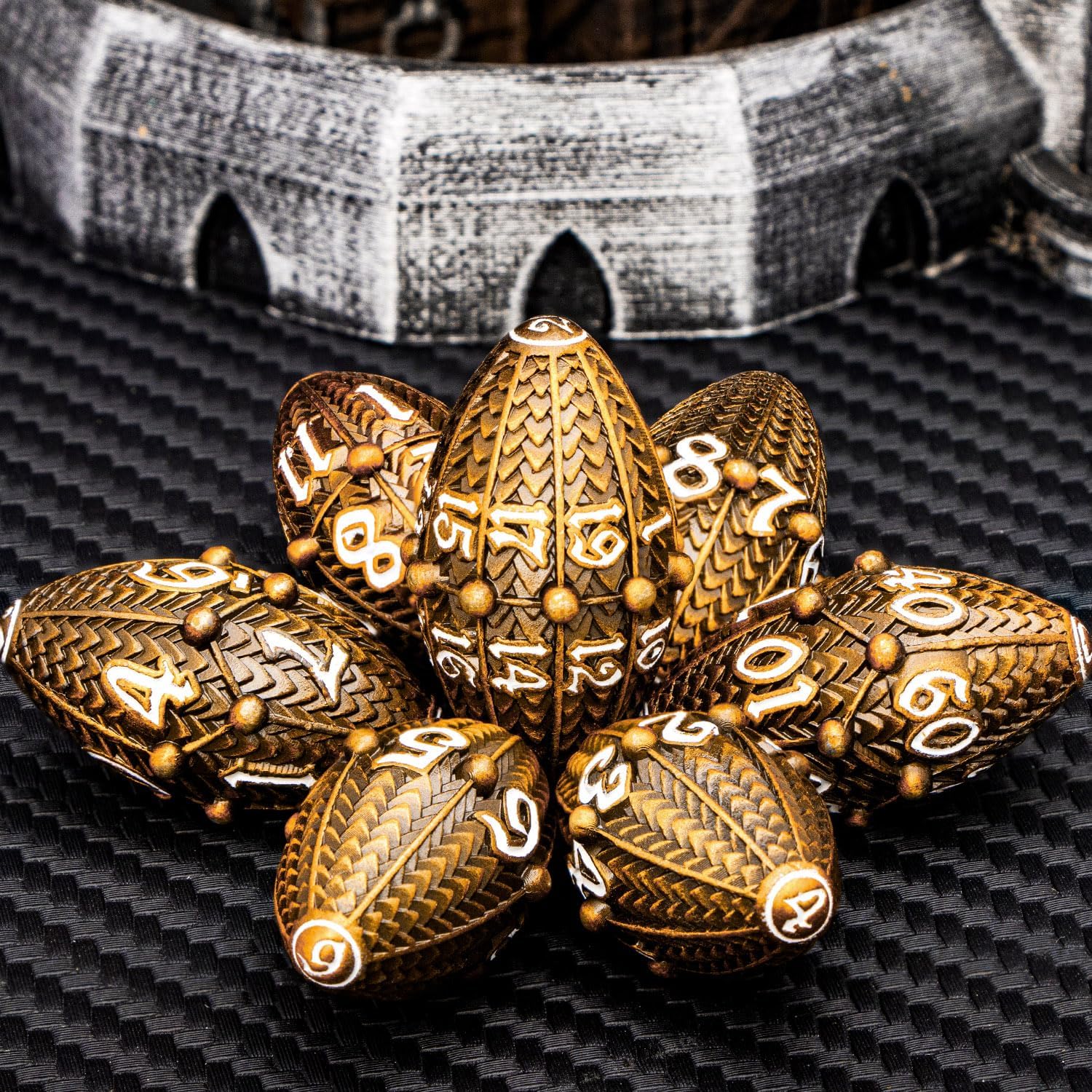 ARUOHHA DND Metal Dice Antique Gold Dragon Egg Dice with Metal Box, Role Playing Game RPG Polyhedral D and D Dice Set D20 D12 D10 D8 D6 D4