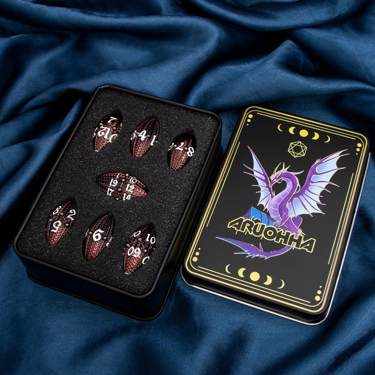 - 【Dragon Egg Dice Set】: Complete your gaming arsenal with this set including D4, D6, D8, D10, D12, D20, and D%, all fitting harmoniously within a metal box for easy storage.
