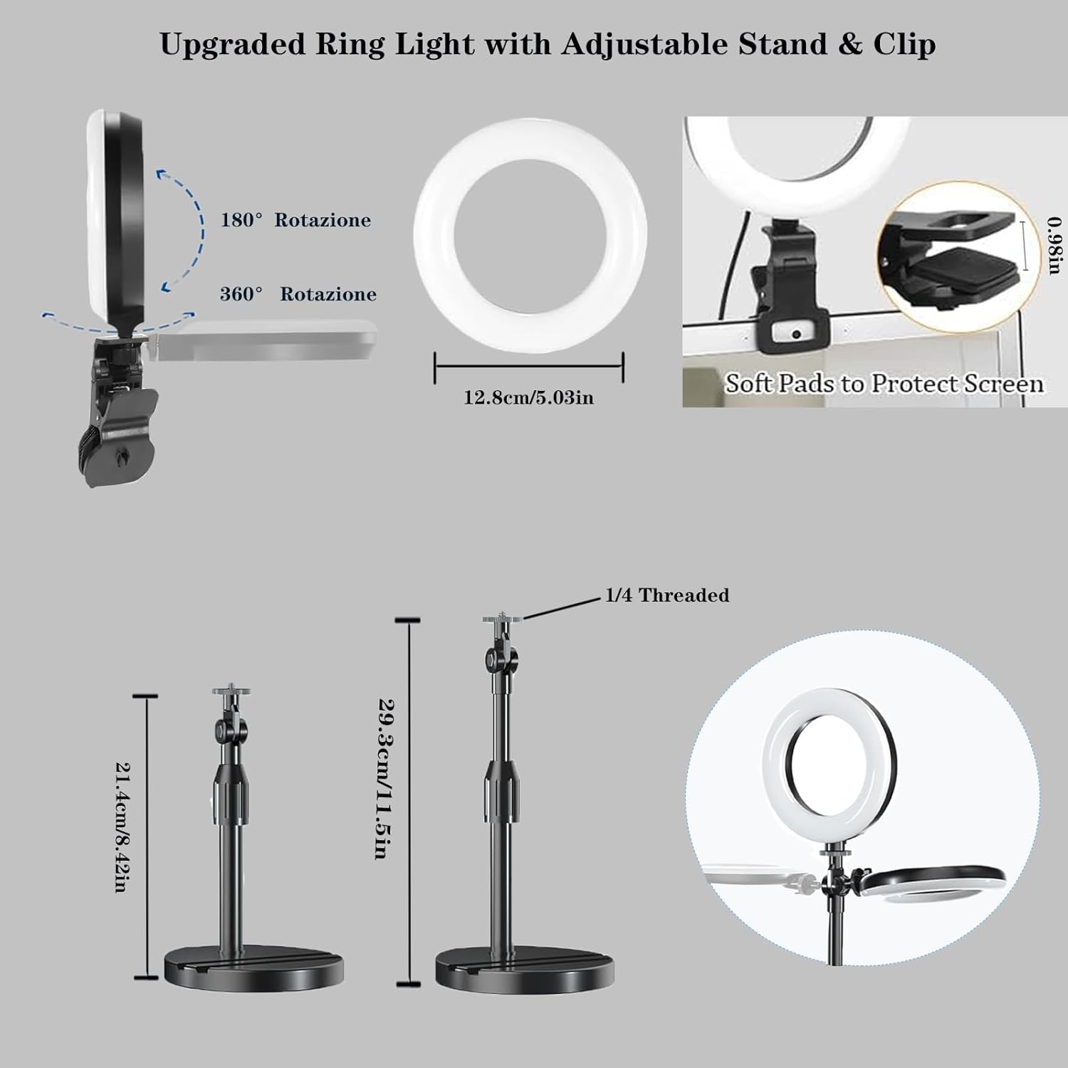 - 【Upgraded Ring Light Kit】: This ring light with 60 LEDs offers up to 450Lx illumination at 0.5m, 3000K-6500K color temperature, CRI>97. The clip on ringlight of this photography & lighting accessories kit can mount on laptops, computers, desktop displays, monitors with a thickness under 1"/2.5cm, up to 10W brightniss is more brighter.