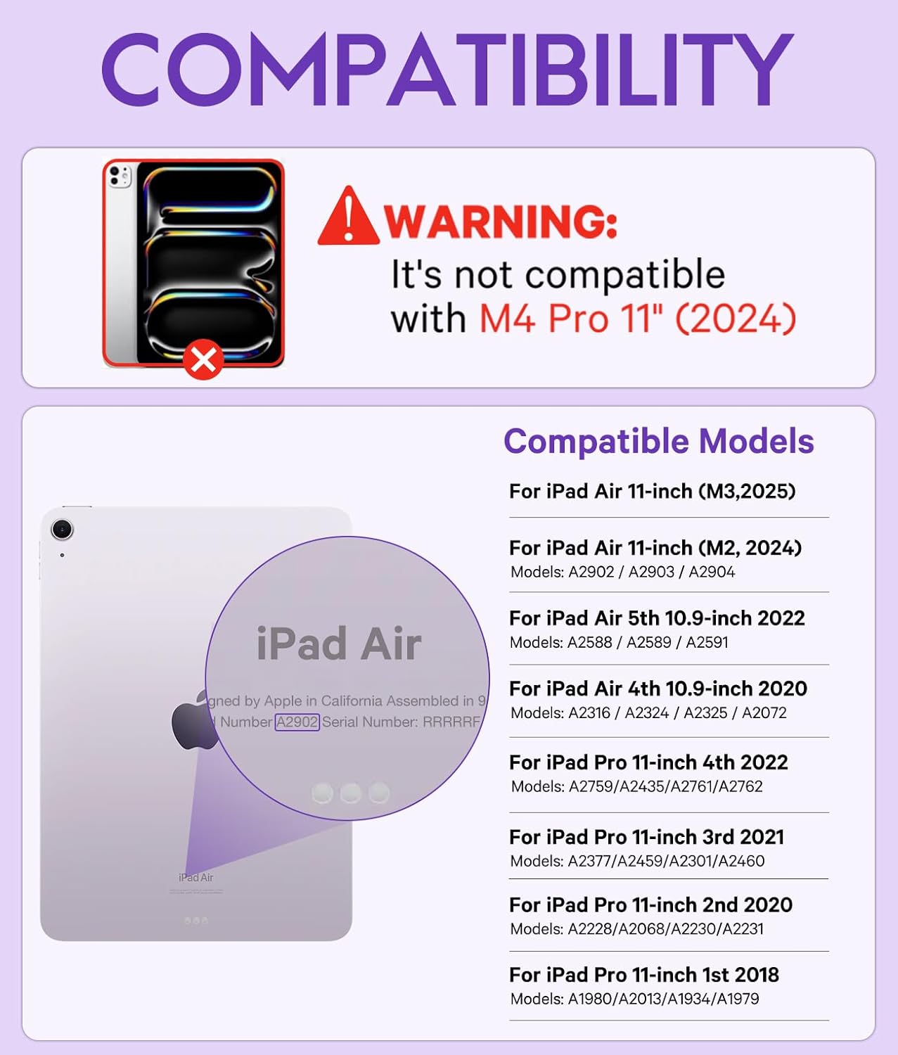 - Compatible Devices : iPad Air 11 inch (M3/M2) 2025/2024, iPad Air 5th/4th Gen., iPad Pro 11" 4th/3rd/2nd/1st Gen.(Not for Pro 11" M4 2024) iPad Air 11 inch (M3/M2) 2025/2024, iPad Air 5th/4th Gen., iPad Pro 11" 4th/3rd/2nd/1st Gen.(Not for Pro 11" M4 2024)