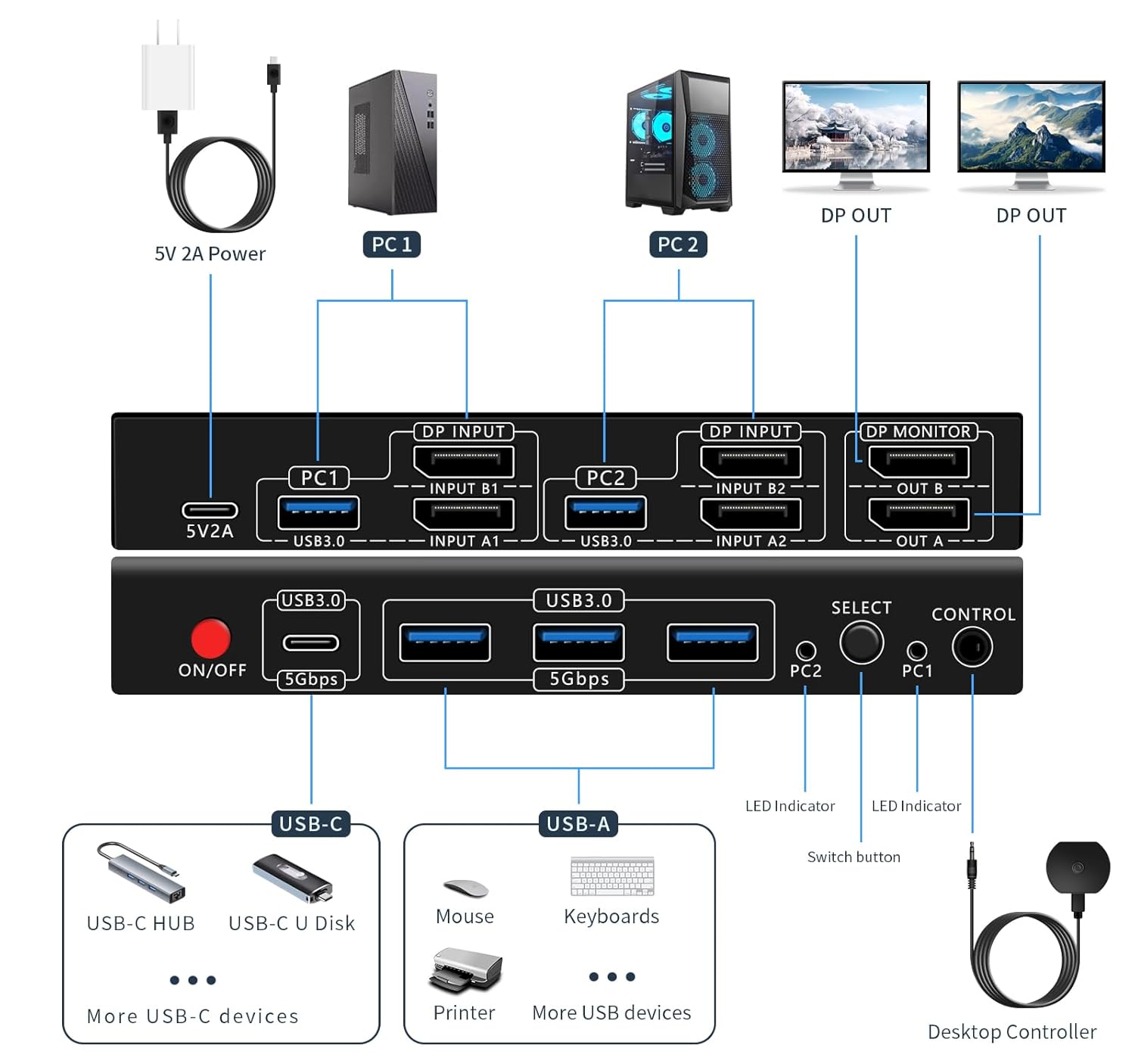 - 【2 Kinds of Switching Methods】This dual monitor kvm switch has 2 kinds of switching methods: button switching and desktop controller switching, switching two signal sources with one key. Using the desktop controller to switch the switch host and related cables can be stowed farther away from the desktop, the desktop is more clean and tidy. Both switching mode switch response time in 2-5 seconds, if only connected to the USB part of the second cut. This model does not support keyboard hotkey switching.