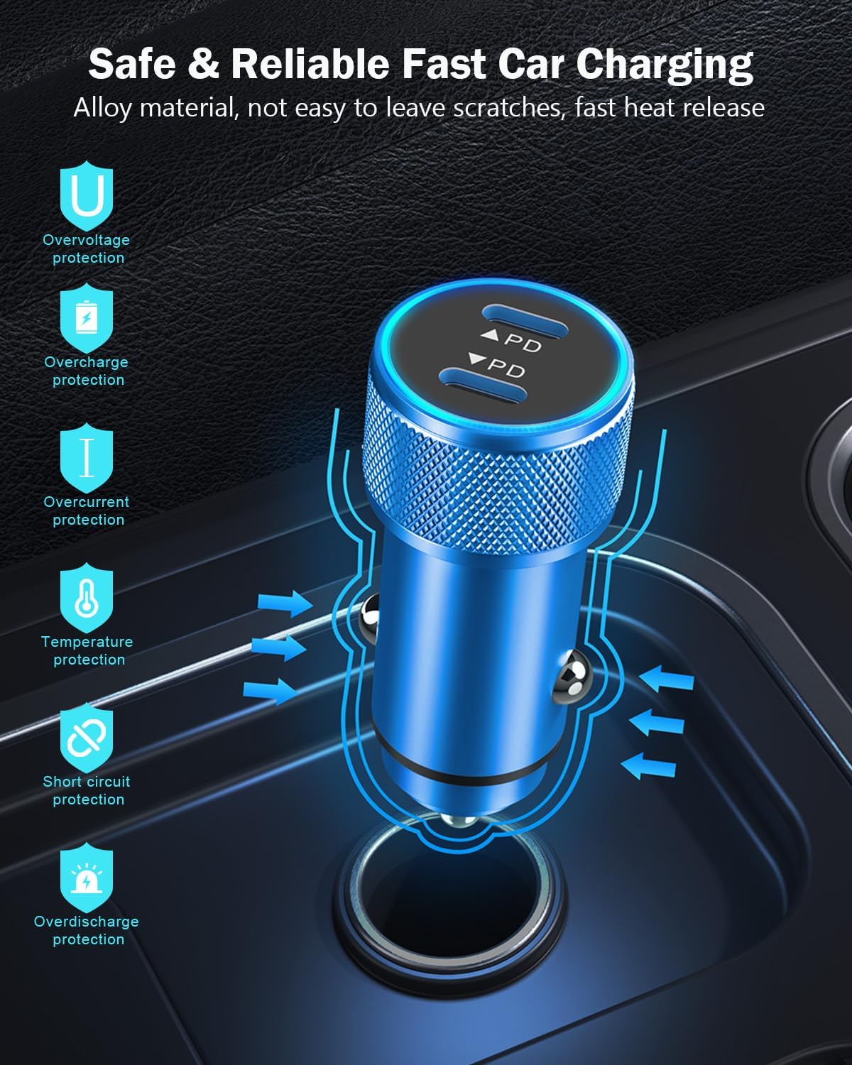 iPhone Car Charger Fast Charging,iPhone 16 Car Charger 2PACK Dual USB C PD3.0 Port CarCharging Adapter and USB C to C Braided Nylon Charging Cable Compatible with iPhone 16/16 Pro Max/15/iPad(Blue)