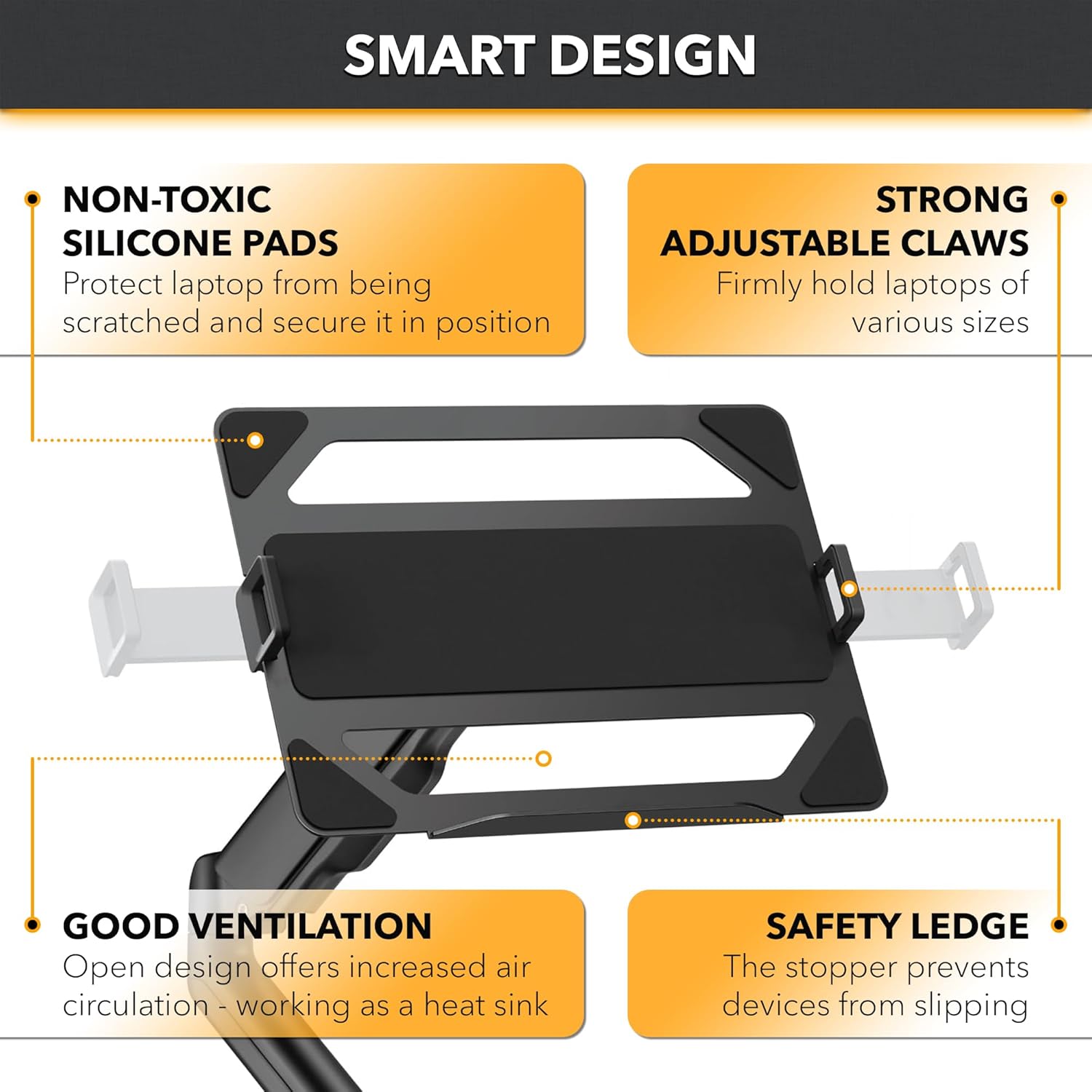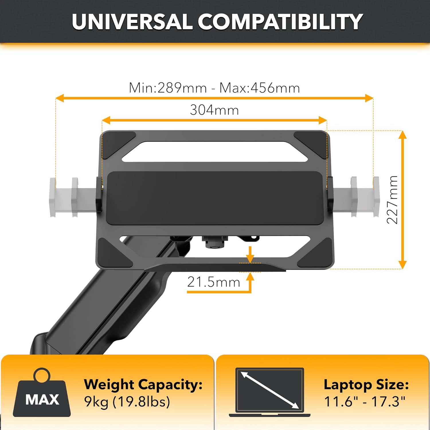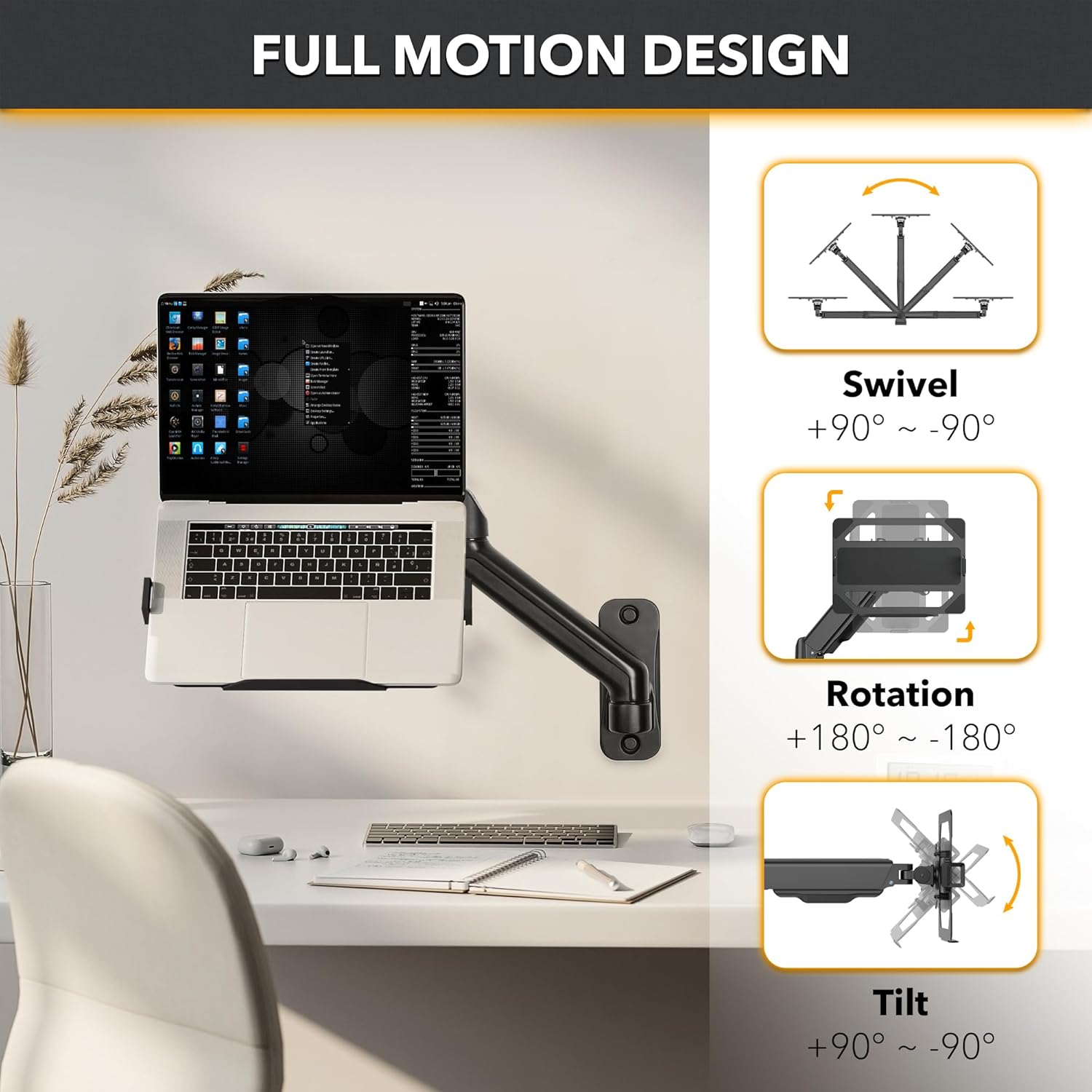 - Full Motion & Free-Tilting Design - With a tilt range of +90° to -90°, this laptop mount offers flexible positioning to reduce glare and achieve an optimal viewing angle. The full motion laptop arm allows you to adjust your laptop to suit your needs, whether for work, gaming, or presentations.