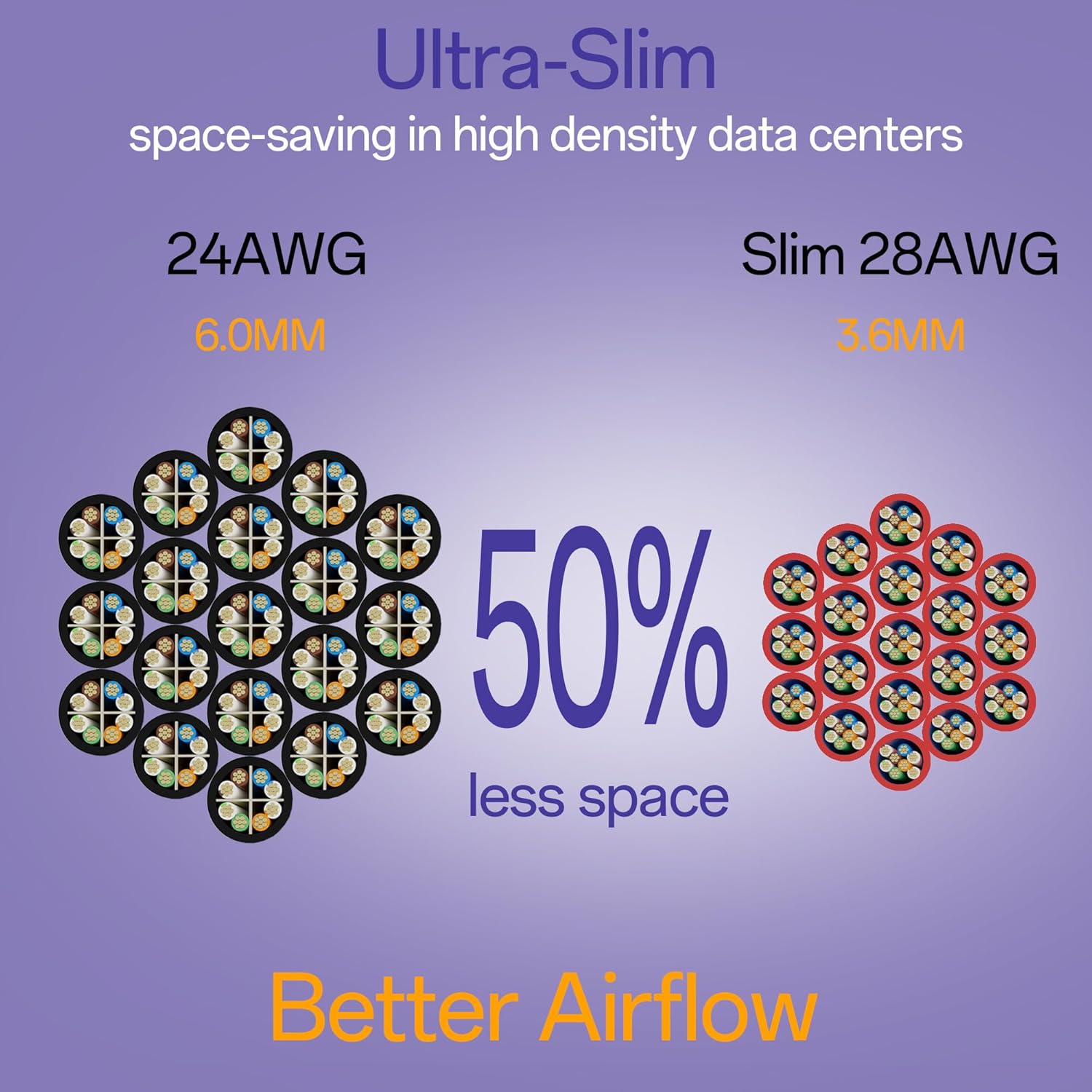 - Better Airflow: With cable diameter of only 3.6mm, the slim Cat6 cable is much thinner and lighter than the standard Cat6 cable, which allows better airflow and heat dissipation in tight spaces.