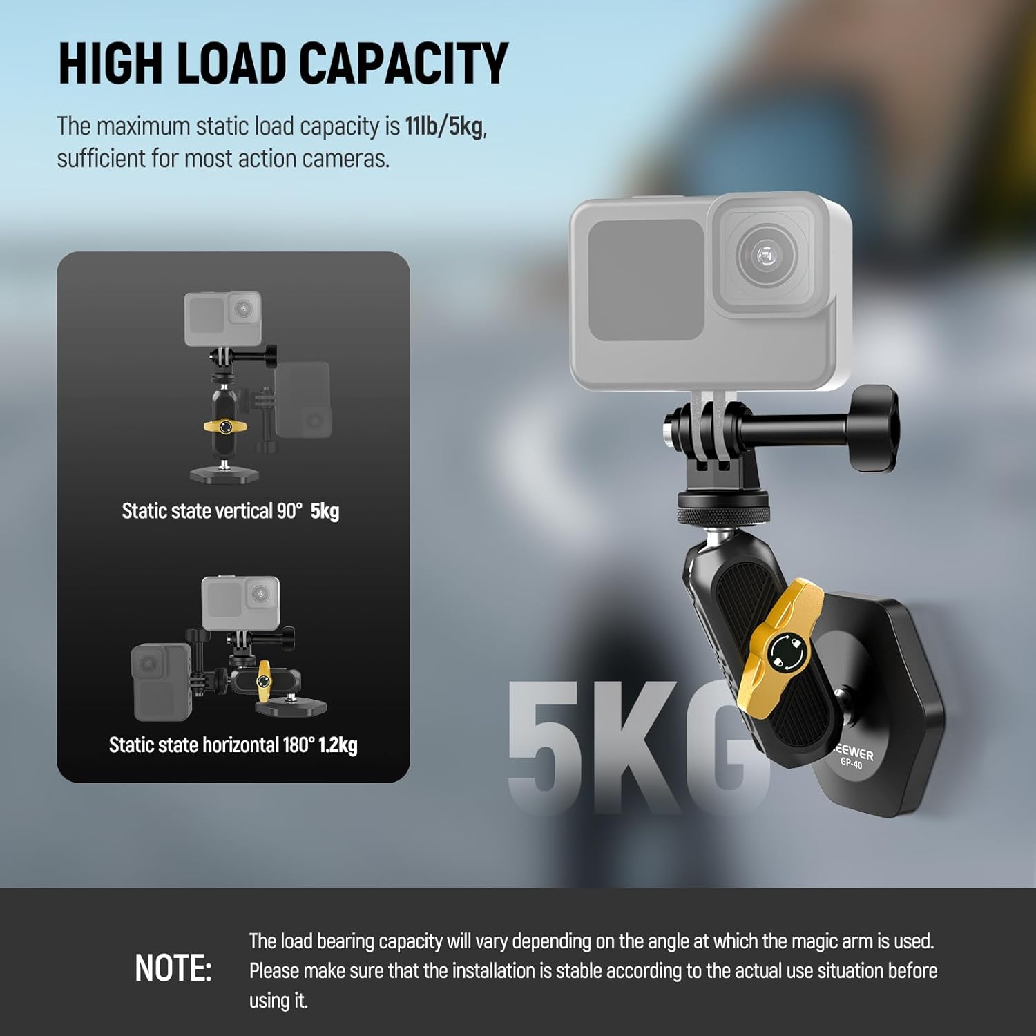 - 【Strong Magnets & High Payload】 Designed with six strong magnets, the base can securely attach to flat iron surfaces, including car doors, hoods, railings, and fences for outdoor video recording. Statically, it can endure a 11lb/5kg vertical pull and support 2.6lb/1.2kg horizontally. Note: Figures are tested in static conditions. Do not use for surfing, skiing, canoeing, and sports with high impact and intensity