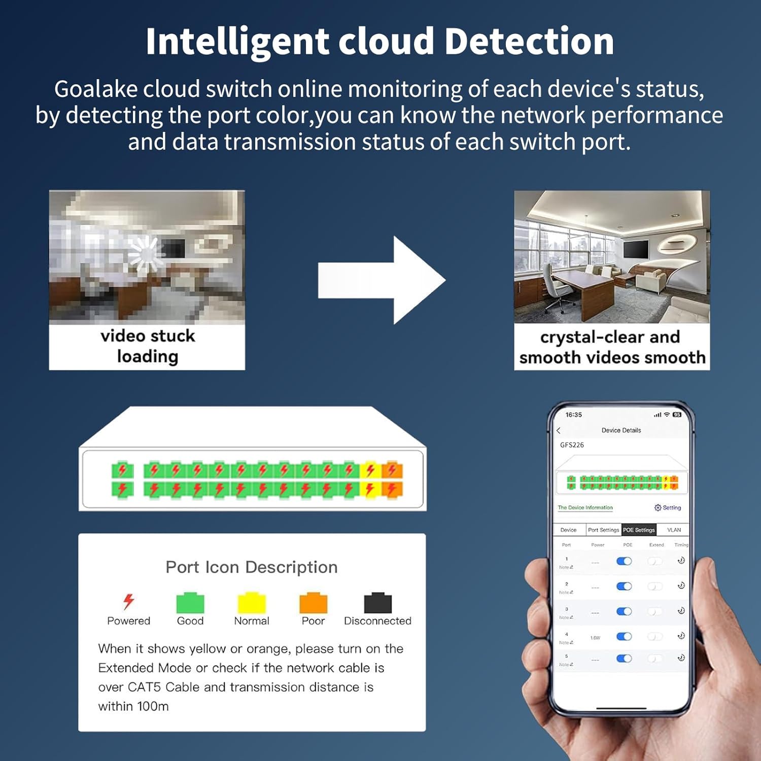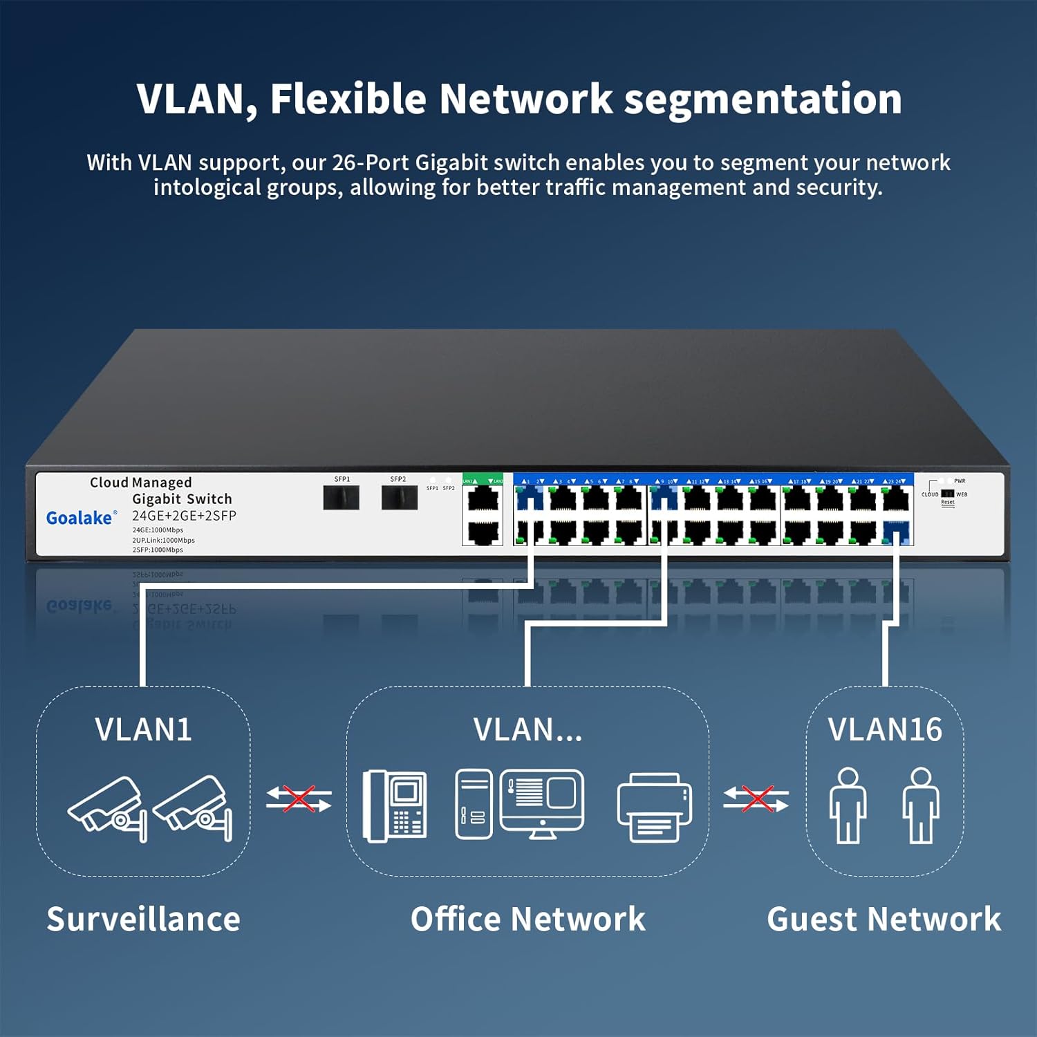 - Effortless Management via APP or Web Interface: Easy Smart Management allows you to manage and configure your network effortlessly via a app or a comprehensive web interface and free software. The Goalake 26-Port Managed Gigabit Switch is an exceptional choice for any business seeking robust network management capabilities.