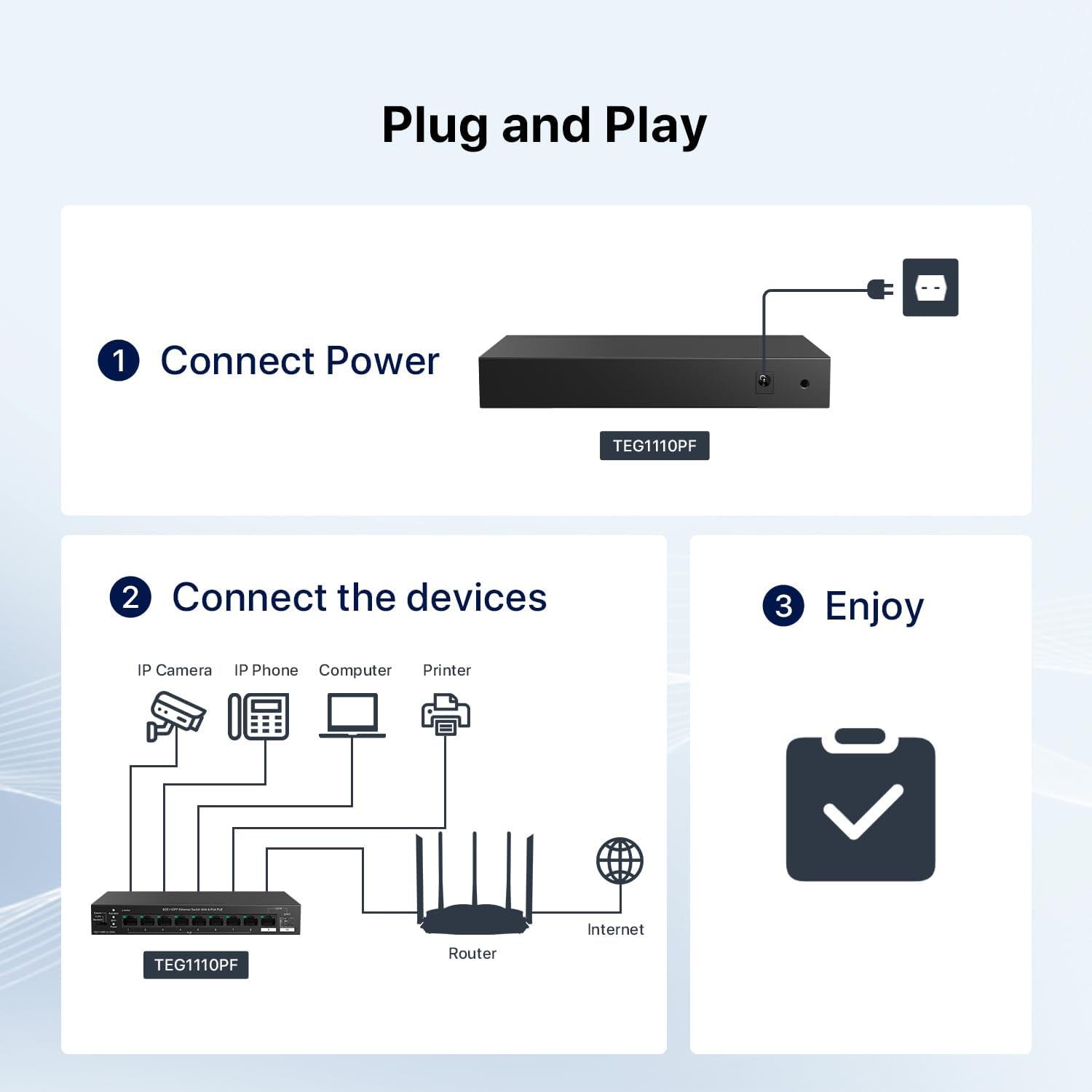 - 𝐒𝐦𝐚𝐫𝐭 𝐏𝐨𝐄 𝐏𝐨𝐰𝐞𝐫 𝐒𝐮𝐩𝐩𝐥𝐲: The switch provides 8 gigabit PoE ports compliant with lEEE 802.3af/at standards, capable of transmitting data and supplying power for HD PoE cameras or gigabit APs. The maximum PoE output of a single port is 30 W and the total power consumption of the switch is 120W.