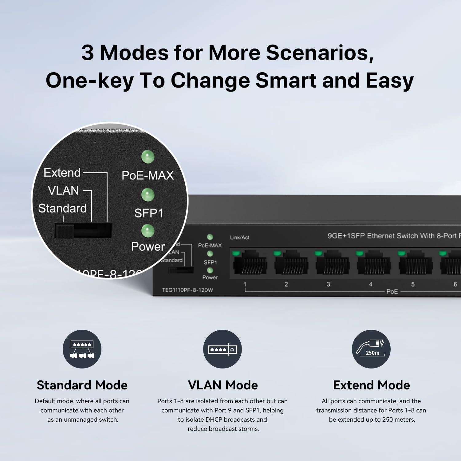 - 𝗢𝐧𝐞 𝗞𝐞𝐲 𝗩𝗟𝗔𝗡: With VLAN mode enabled, PoE+ ports 1-8 will isolate themselves respectively, while maintaining communication with the 9th port, to protect you from broadcast-storms and DHCP spoofing