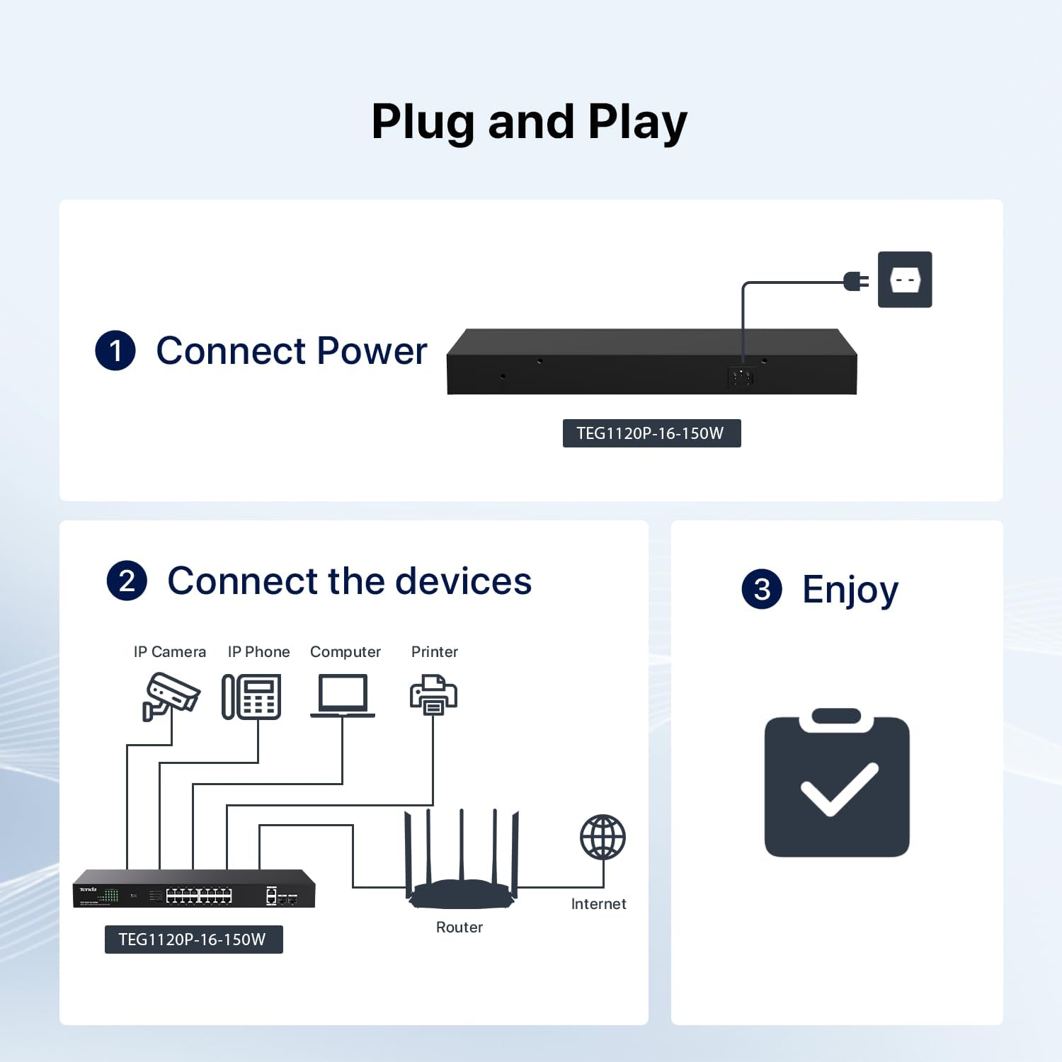 - 𝗣𝐥𝐮𝐠 𝐚𝐧𝐝 𝗣𝐥𝐚𝐲: 16 port PoE+ switch requires no configuration or software, supports desktop/ wall/ rack mounting. Tenda TEG1120P-16-150W is your perfect 16 port PoE switch Gigabit choice