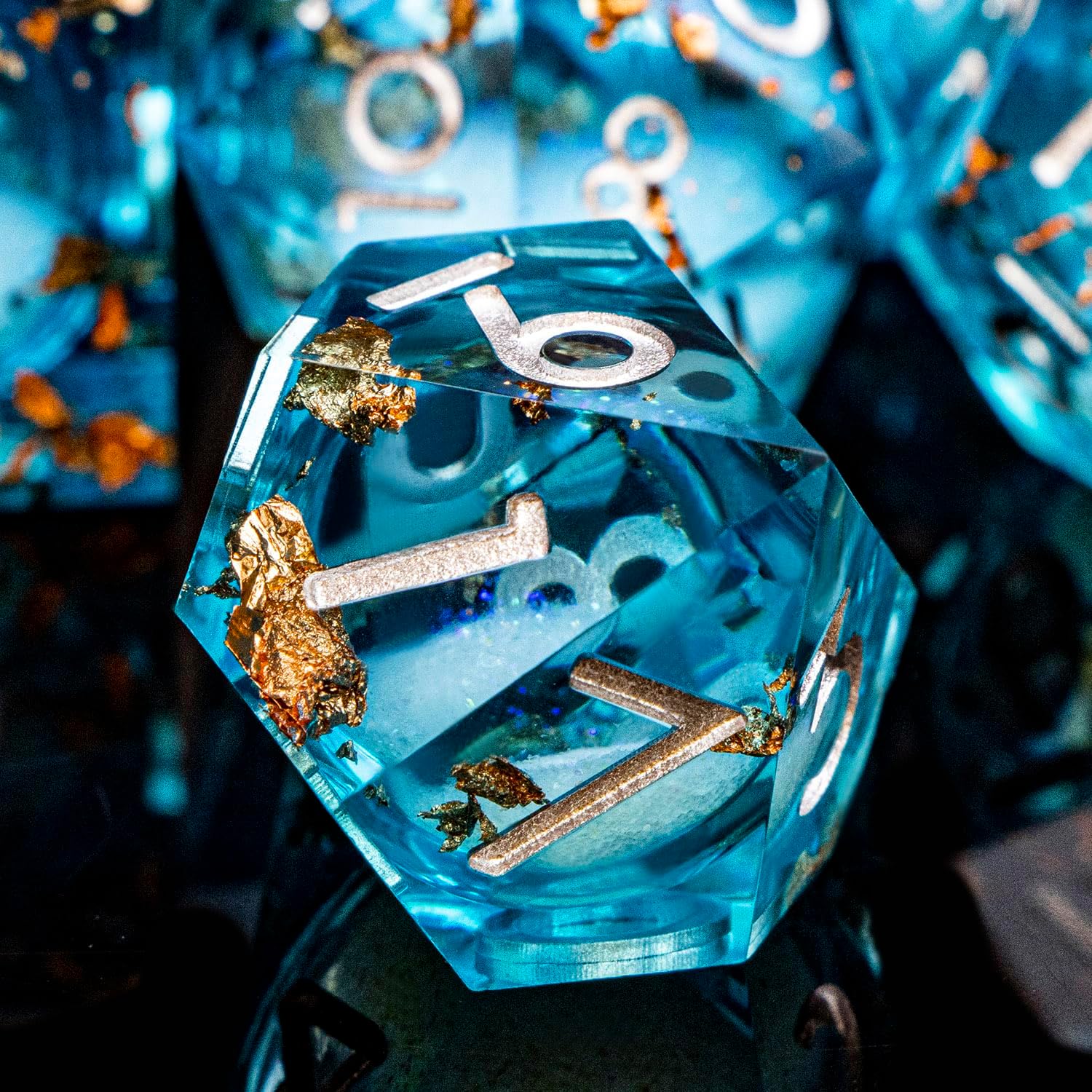 DND Dice Blue Liquid Core Dice Set with Metal Box, Handmade Sharp Edge D and D Polyhedral Dice for use with RPG D&D Role Playing Game