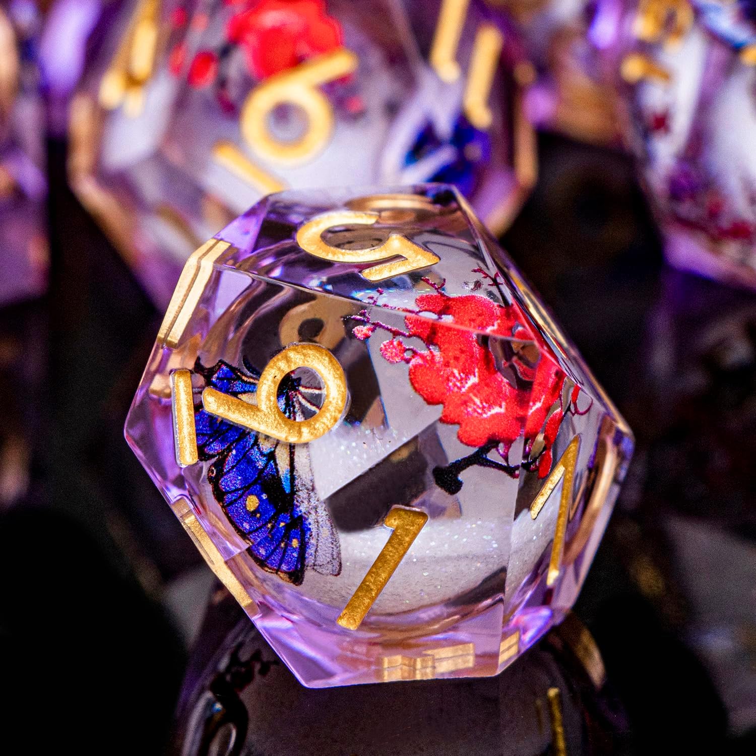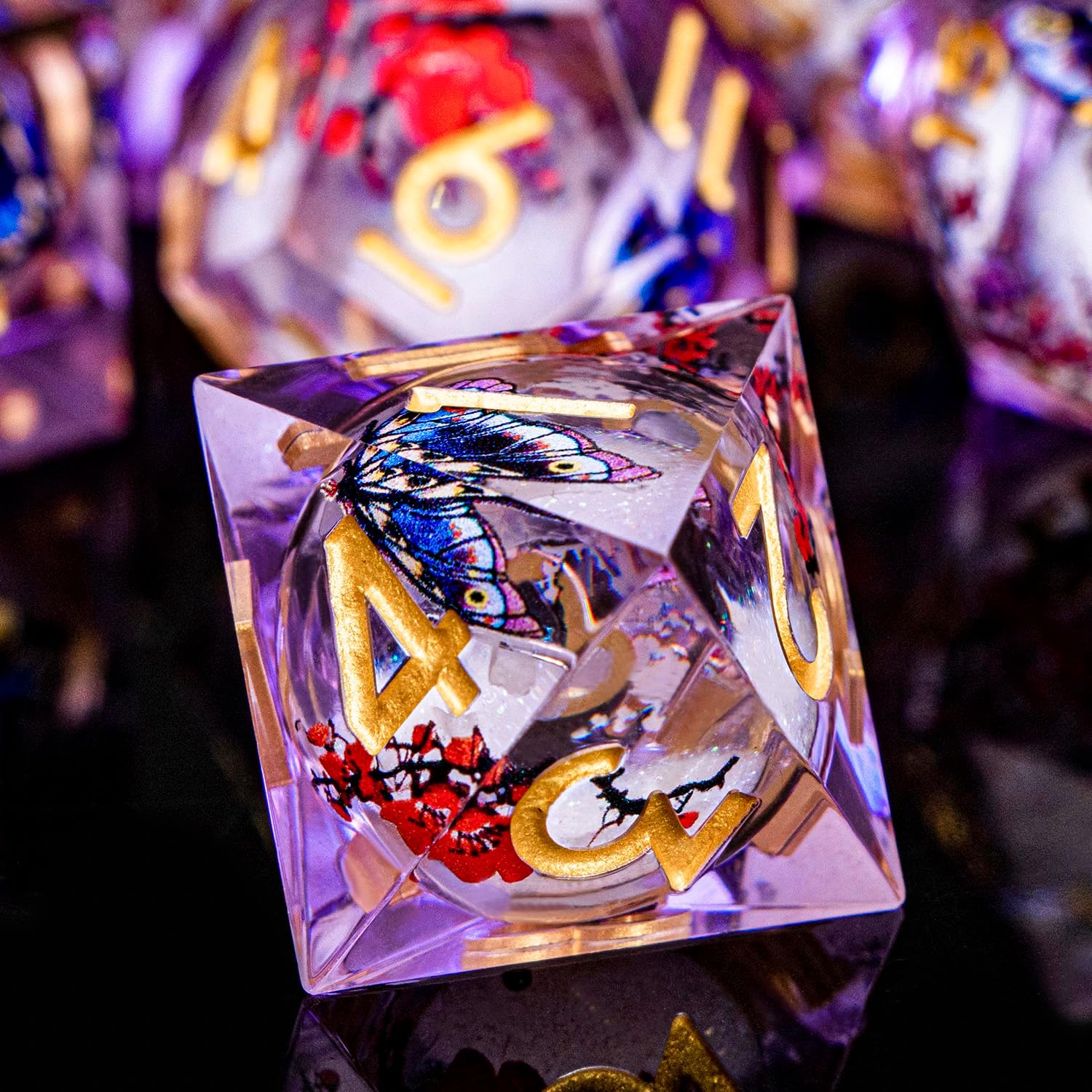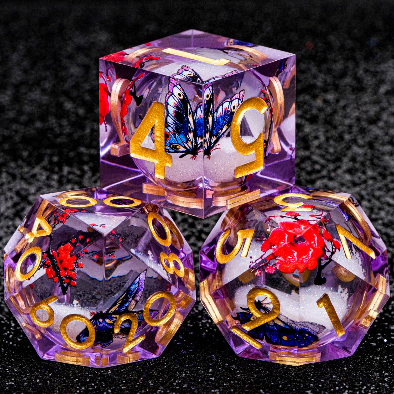 Butterfly DND Dice Purple Liquid Core Dice Set with Metal Box, Handmade Sharp Edge D and D Polyhedral Dice for use with D&D Role Playing Game, D20 D12 D10 D8 D6