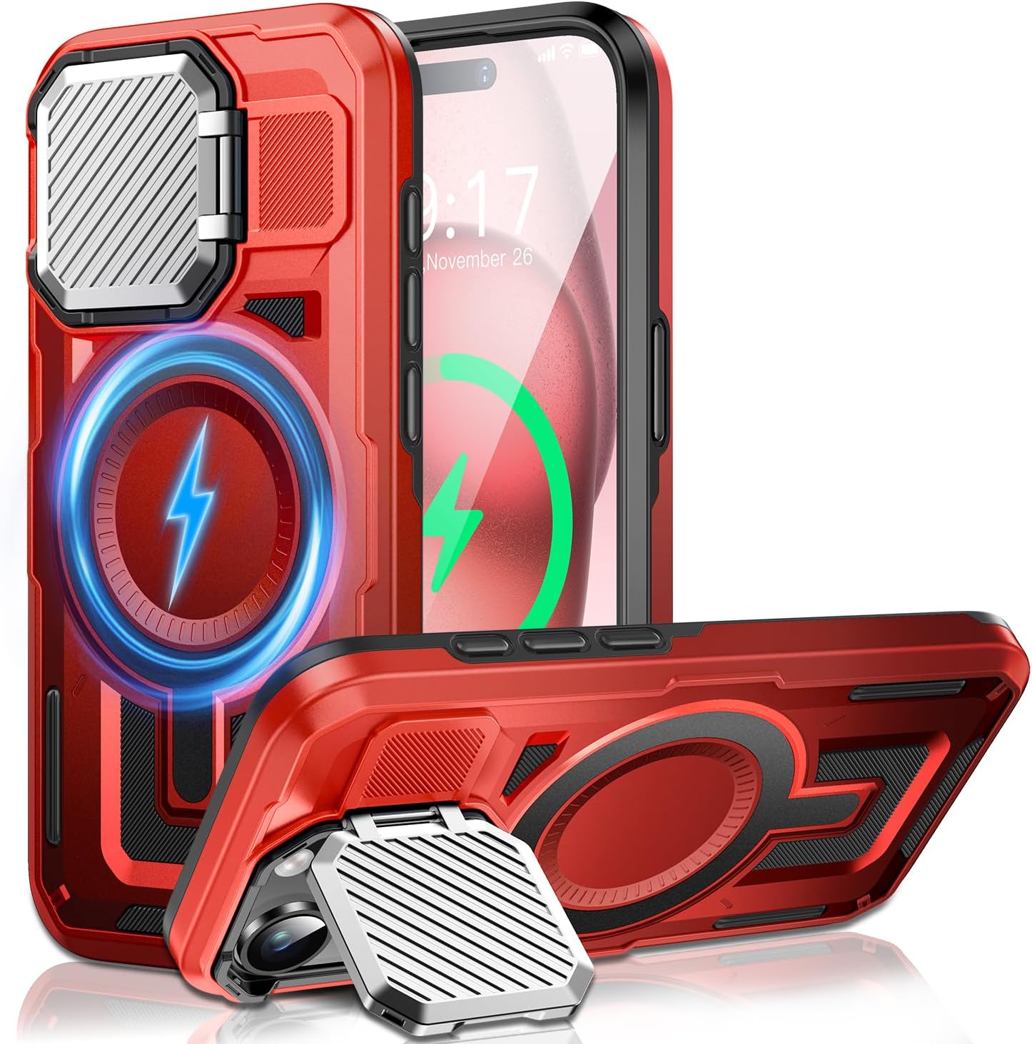 Camera Stand Case for iPhone 15, [Compatible with MagSafe] [Lens Cover] 2024 Version Military Grade Protective Soft Case for iPhone 15 6.1 inch Men Women, Red