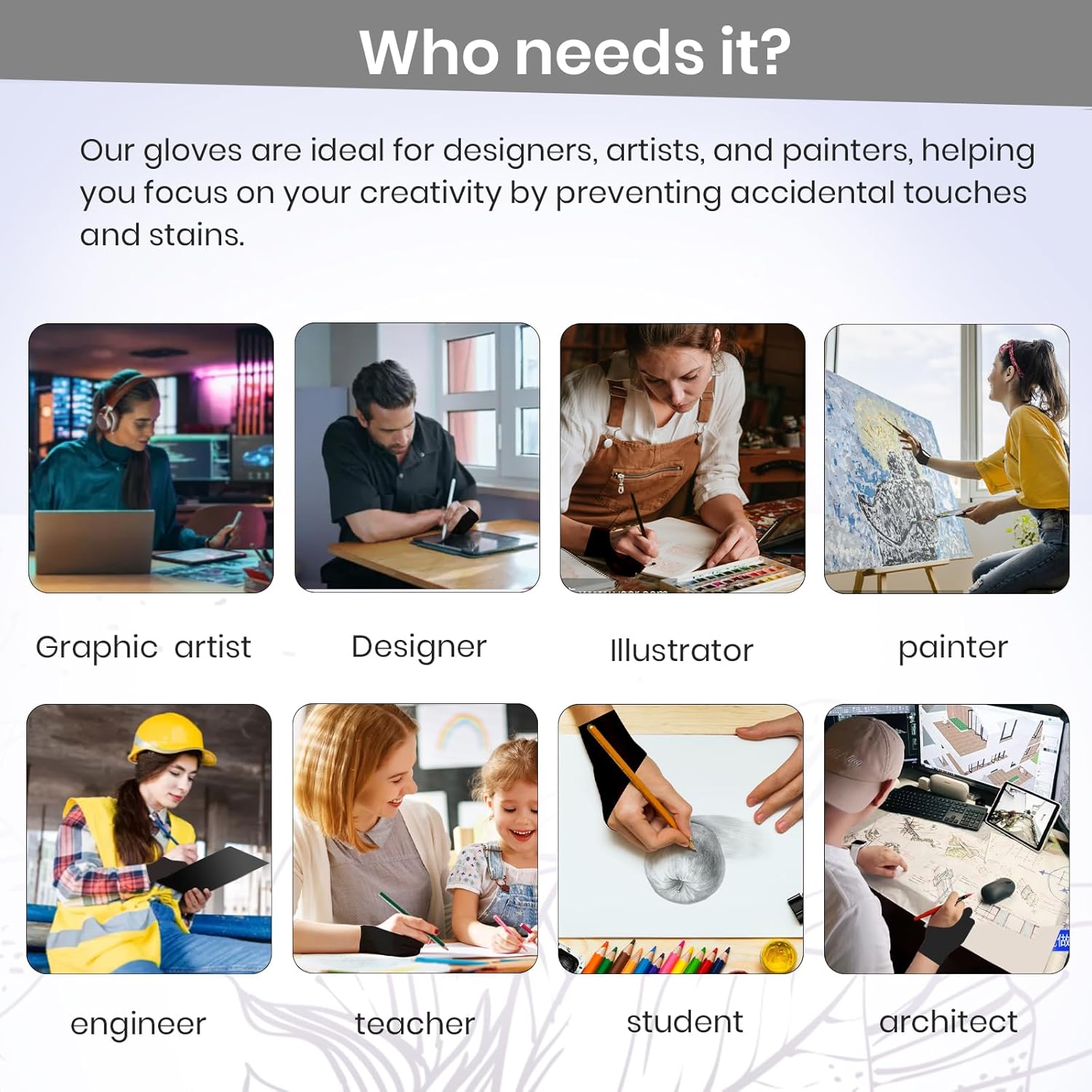 - Two Fingers Design Work for Both Hands: No matter left- or right-handed, this drawing glove fits comfortably on either hand, The ambidextrous design adapts to your hand shape, allowing you to focus on creating without any distractions
