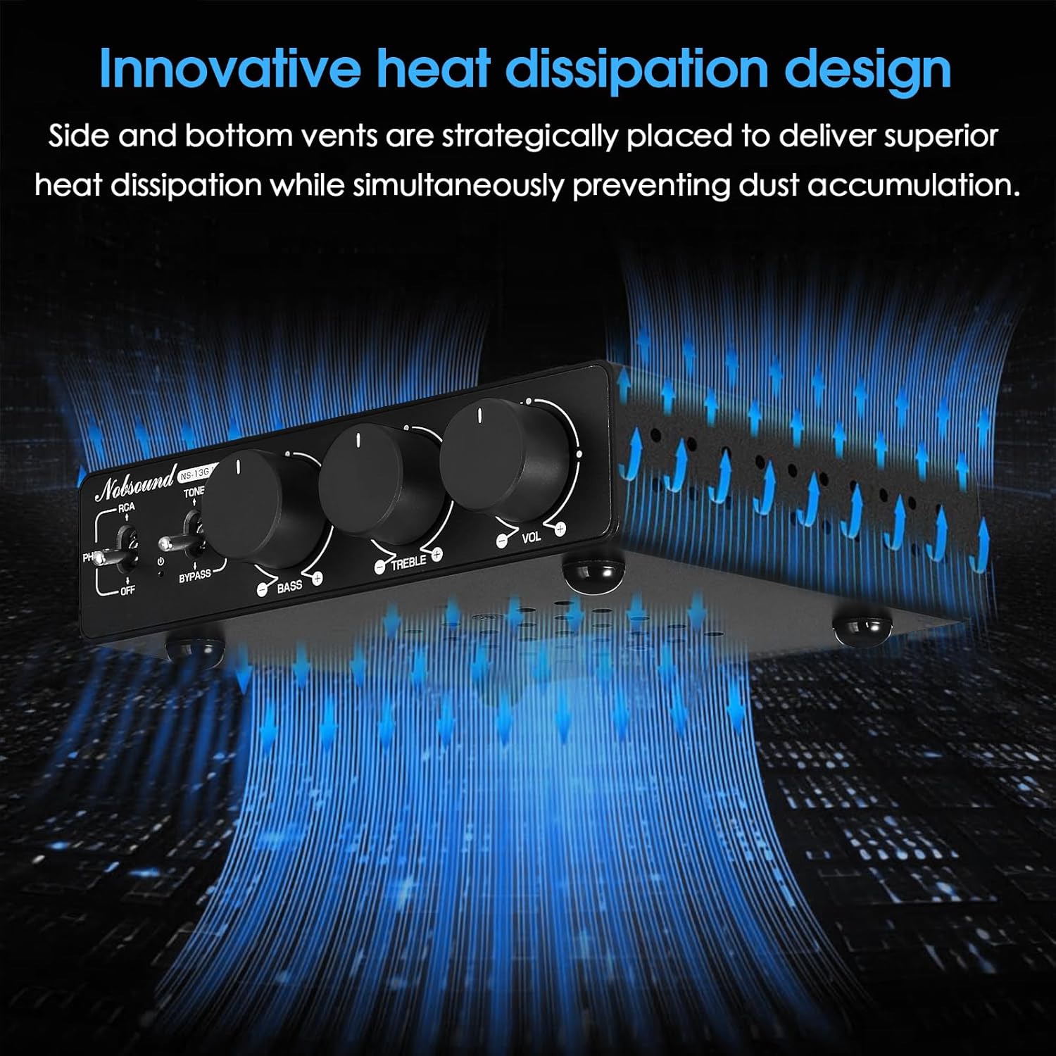 - PRO-GRADE COMPONENTS, SILENT OPERATION: Engineered with NE5532P preamp chips, Japanese Rubycon capacitors, and WIMA film capacitors for warm, dynamic sound reproduction. Advanced thermal management (precision-cut aluminum chassis + dual cooling vents) ensures whisper-quiet performance even at max volume.