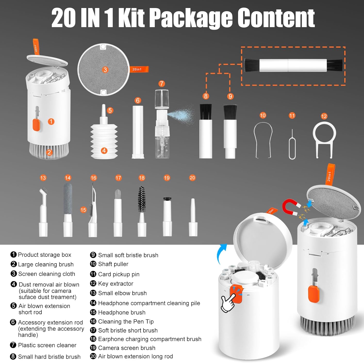 - 2 Pack 20 in 1 Keyboard Screen Cleaner Kit: One of computer cleaning kit includes an Airpod cleaner pen, flocking sponge, mini soft brush, len brush, earphone case cleaning brush, and camera brush (All these brushes with the help of an extension rod which could use easier), screen cleaner spray, microfiber fiber cloth of the lid, retractable keyboard brush, keycap puller, shaft puller, air blower with 2 rods for extending, dual head brush (hard and soft bristle brush), card pickup pin.