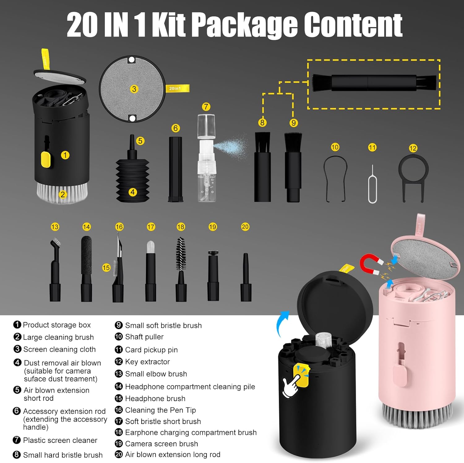 - 2 Pack 20 in 1 Keyboard Screen Cleaner Kit: One of computer cleaning kit includes an Airpod cleaner pen, flocking sponge, mini soft brush, len brush, earphone case cleaning brush, and camera brush (All these brushes with the help of an extension rod which could use easier), screen cleaner spray, microfiber fiber cloth of the lid, retractable keyboard brush, keycap puller, shaft puller, air blower with 2 rods for extending, dual head brush (hard and soft bristle brush), card pickup pin.