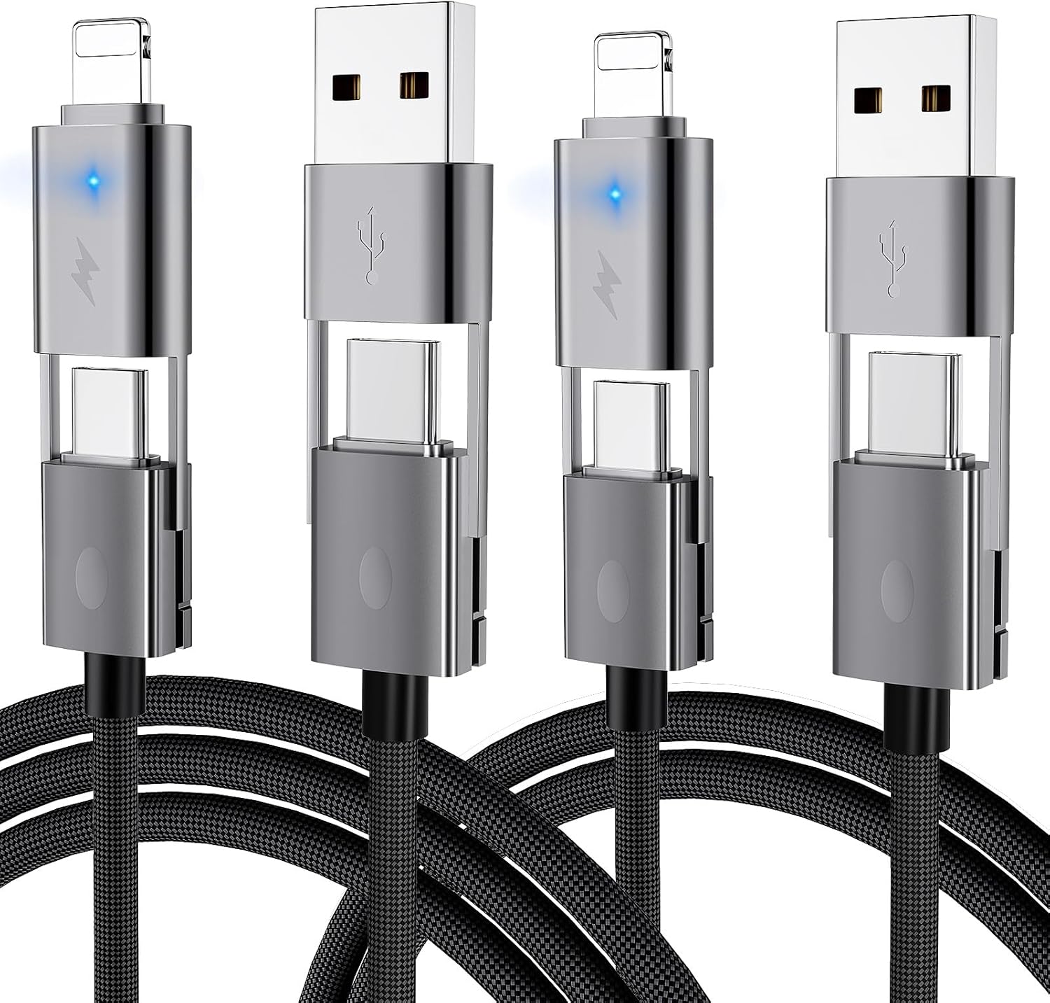 - New Upgraded 4-in-1 Multi Fast Charging Cable: Simplify your charging setup with our versatile 4-in-1 usb-c cable. It combines 4 ports - USB-C to L port, USB-C to USB-C port,USB-A to USB-C port and USB-A to L port. Charge and sync your devices without the hassle of switching between multiple cables. (Note: If your devices want to achieve fast charging, please use a USB C power adapter not the USB charger)