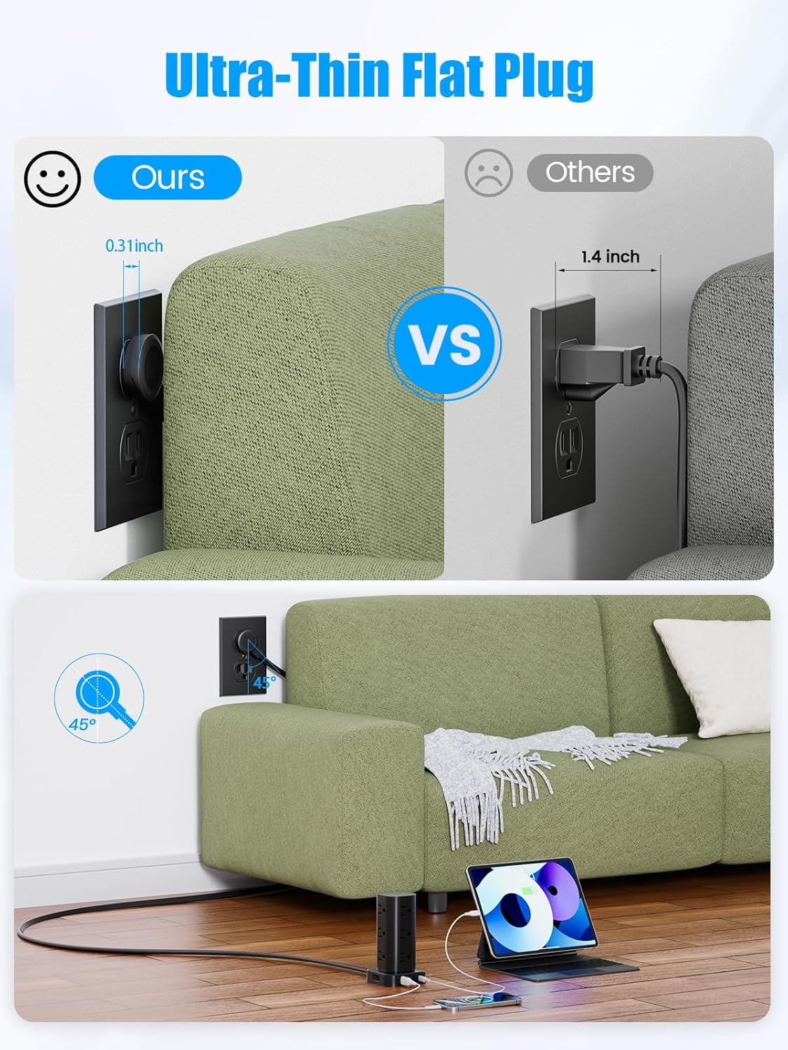 - 【Flat Plug Extension Cord】Featuring a 0.31 in ultra-thin flat head, this flat plug power strip seamlessly fits into narrow spaces and can be discreetly tucked behind sofas, beds, or nightstands, sitting flush against the wall. The 45° angled design also allows for additional plug space underneath without obstruction.