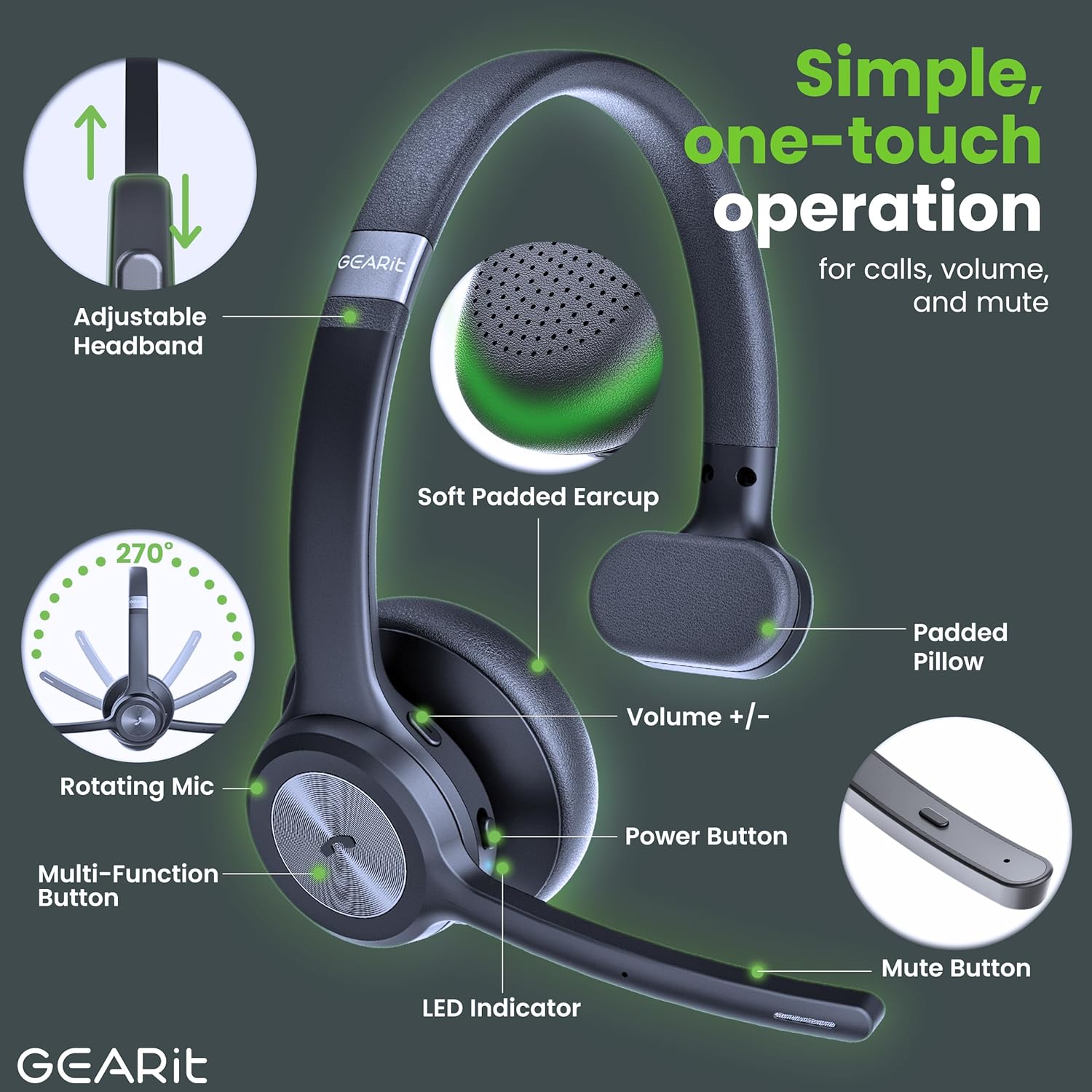 - Crystal-Clear Audio with GEARit Wireless Headset: Enjoy impeccable call quality with an advanced 270° Environmental Noise Cancelling (ENC) microphone headset, eliminating 99% of background noise; perfect for home, office, truck, or construction site use.