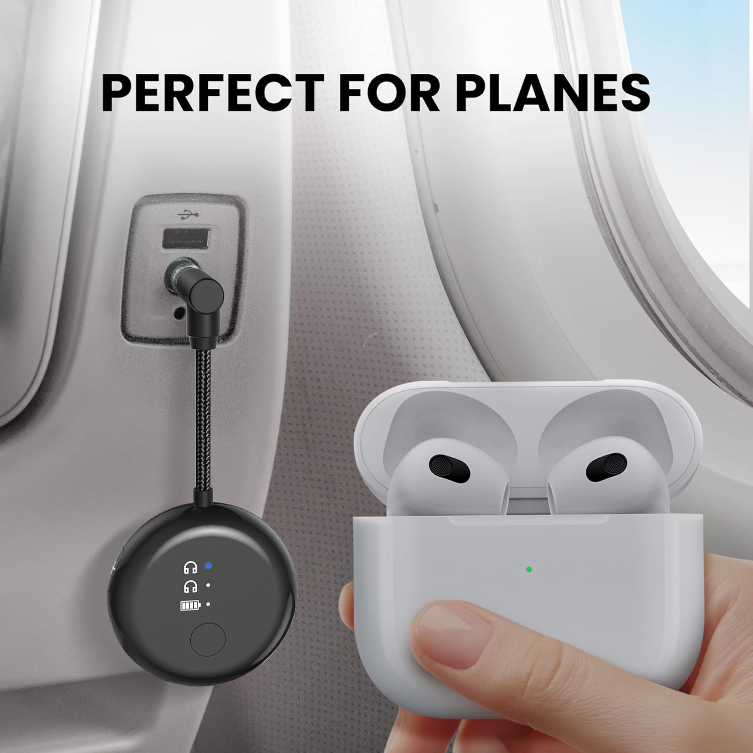 - 【DESIGNED FOR AIRPLANE TRAVEL】 Connect your Bluetooth headphones or AirPods to airplane seatback audio using the AUX jack or included dual-prong adapter. Perfect for wireless audio on most flights and planes.
