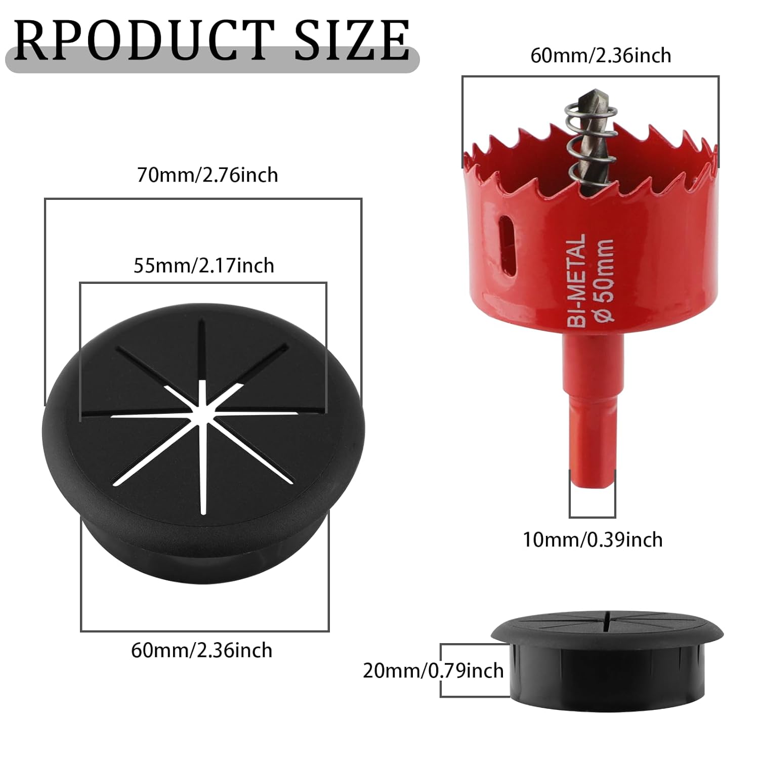 - 【Package Content】You will receive 12pcs 2-3/8IN/60mm black desk grommets with1pack* 2-3/8IN/60mm Hole Saw in the package.The cable grommets are made of sturdy abs engineering grade plastic,and suitable for 2-3/8IN/60mm holes.Durable and Corrosion Resistance.