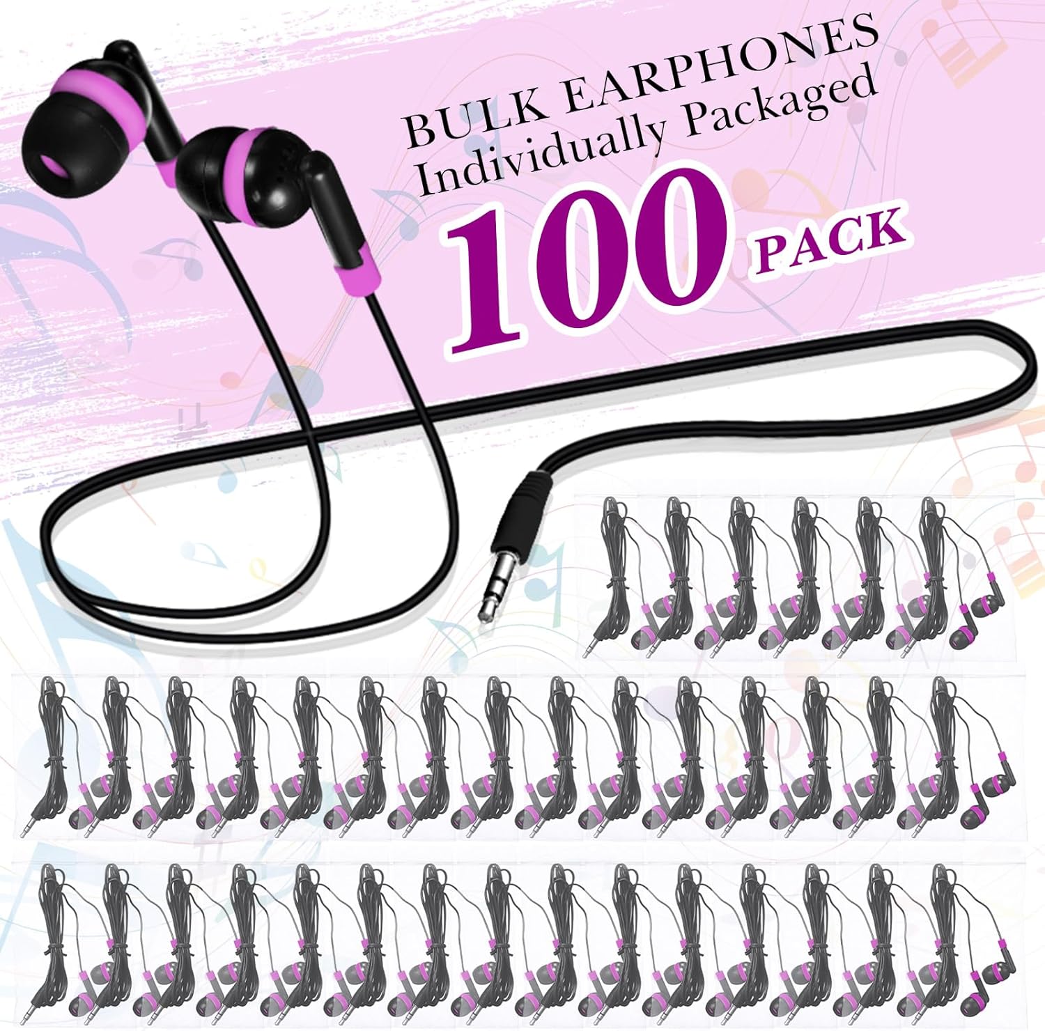 Kanayu 100 Pack Wired Earbuds Bulk for Classroom Ear Headphones Wired Basic Student Earbuds No Microphone with 3.5mm Jack for Kids Class Laptop School Library, Individually Bagged(Pink)