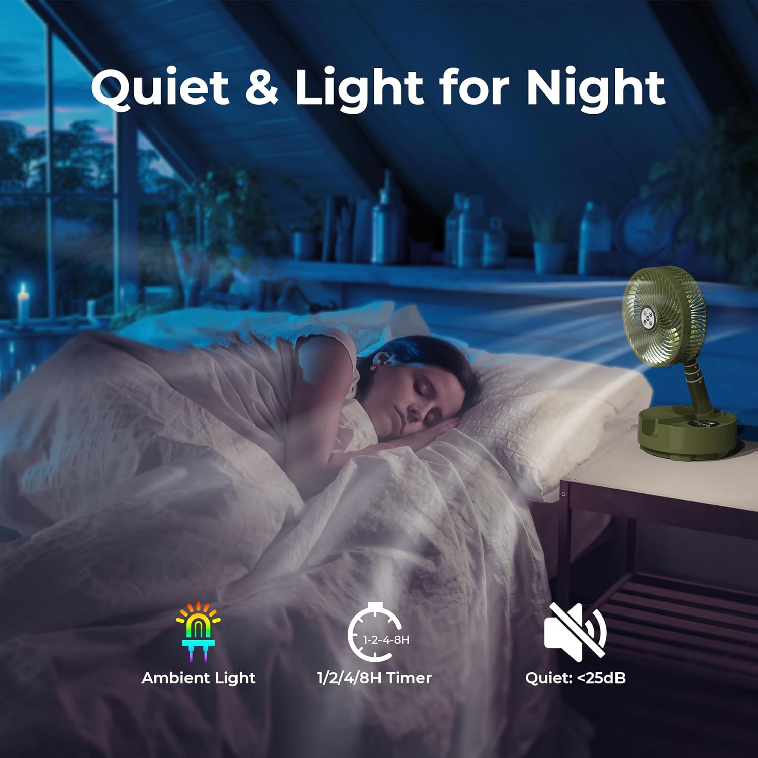 - Quiet, Lights & Timer: The brushless motor keeps noise below 25dB, ensuring a quiet environment for sleeping in tents or cabins. The colorful ambient light creates a relaxing atmosphere. The quiet floor fan for bedroom also features a timer with 1/2/4/8 hour settings for added convenience