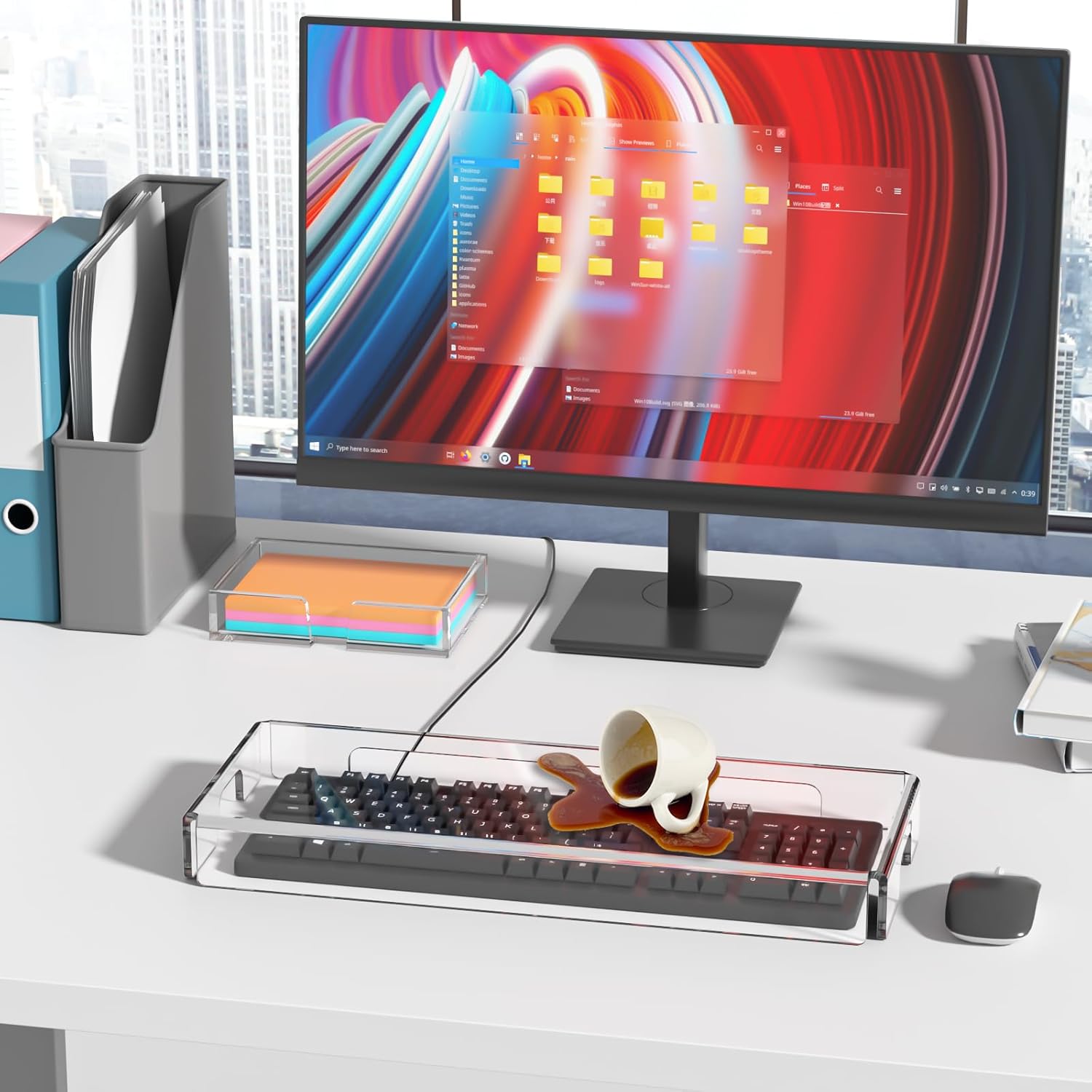 - SPILL-PROOF: acrylic computer keyboard cover is designed to protect 17 inches wide full size standard keyboards from spills, dust and pets such as cats or rabbits walking on your pc keyboard when you step away from your desk, no worry about breadcrumbs falling into the computer keyboard keys aperture whenever you are having a morning coffee at your office desk