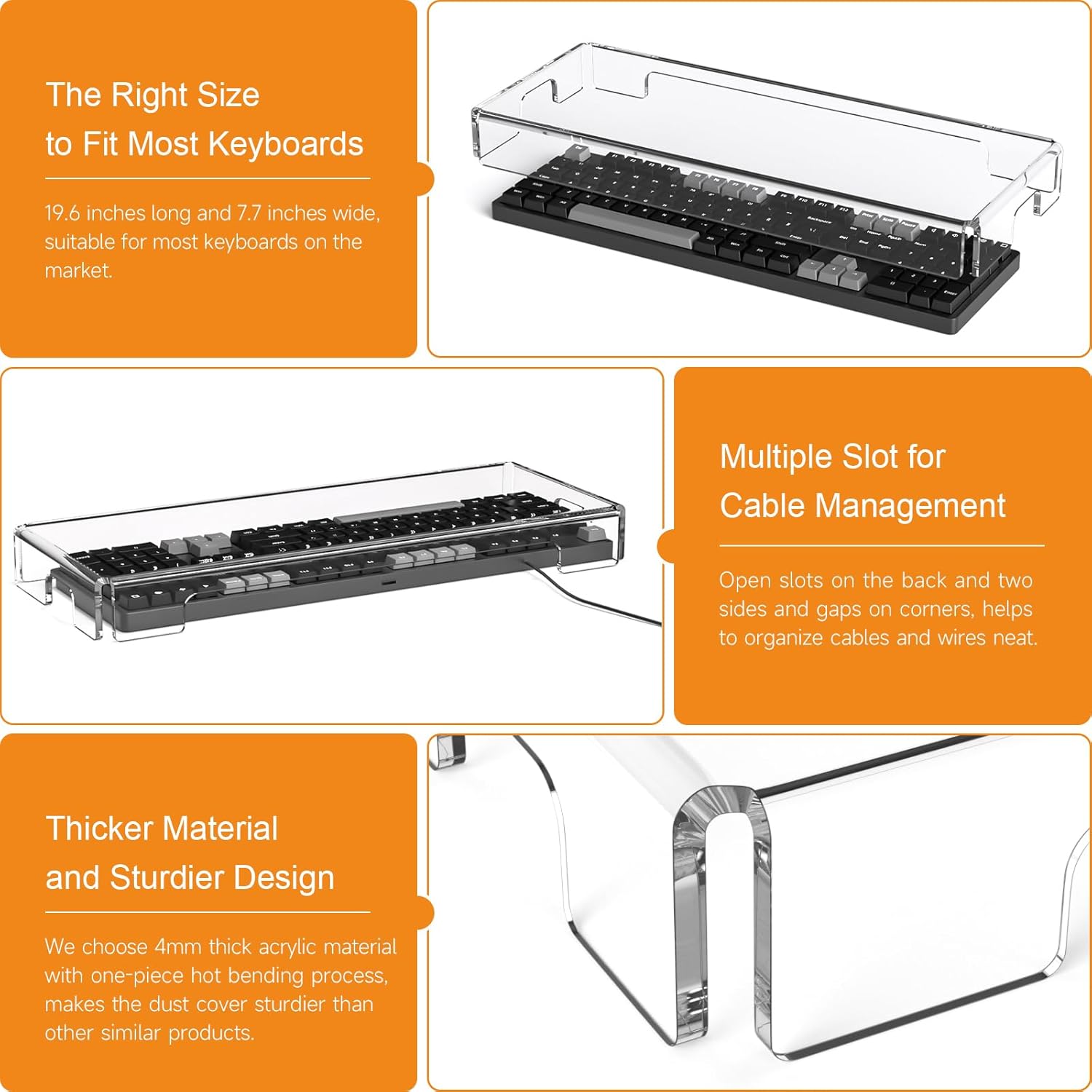 - CABLE MANAGEMENT: open slots on the back and two sides of the functional acrylic keyboard dust cover helps to organize cables and wires neat and makes less clutter on your desktop by giving a minimalistic look, waterproof keyboard shield cover is easy to clean with a wipe if you have your hot coffee spills on it