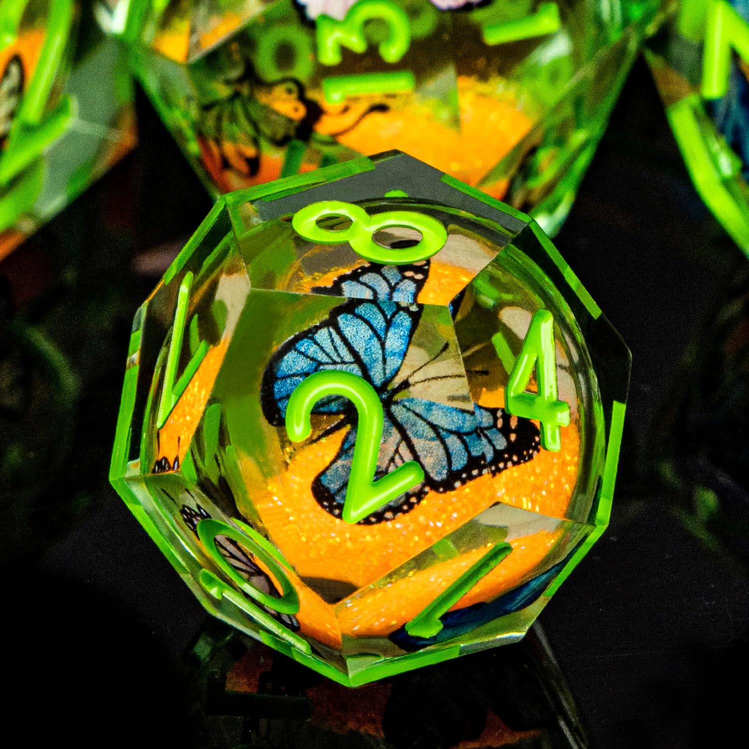 Butterfly DND Dice Green Liquid Core Dice Set with Metal Box, Handmade Sharp Edge D and D Polyhedral Dice for use with D&D Role Playing Game, D20 D12 D10 D8 D6