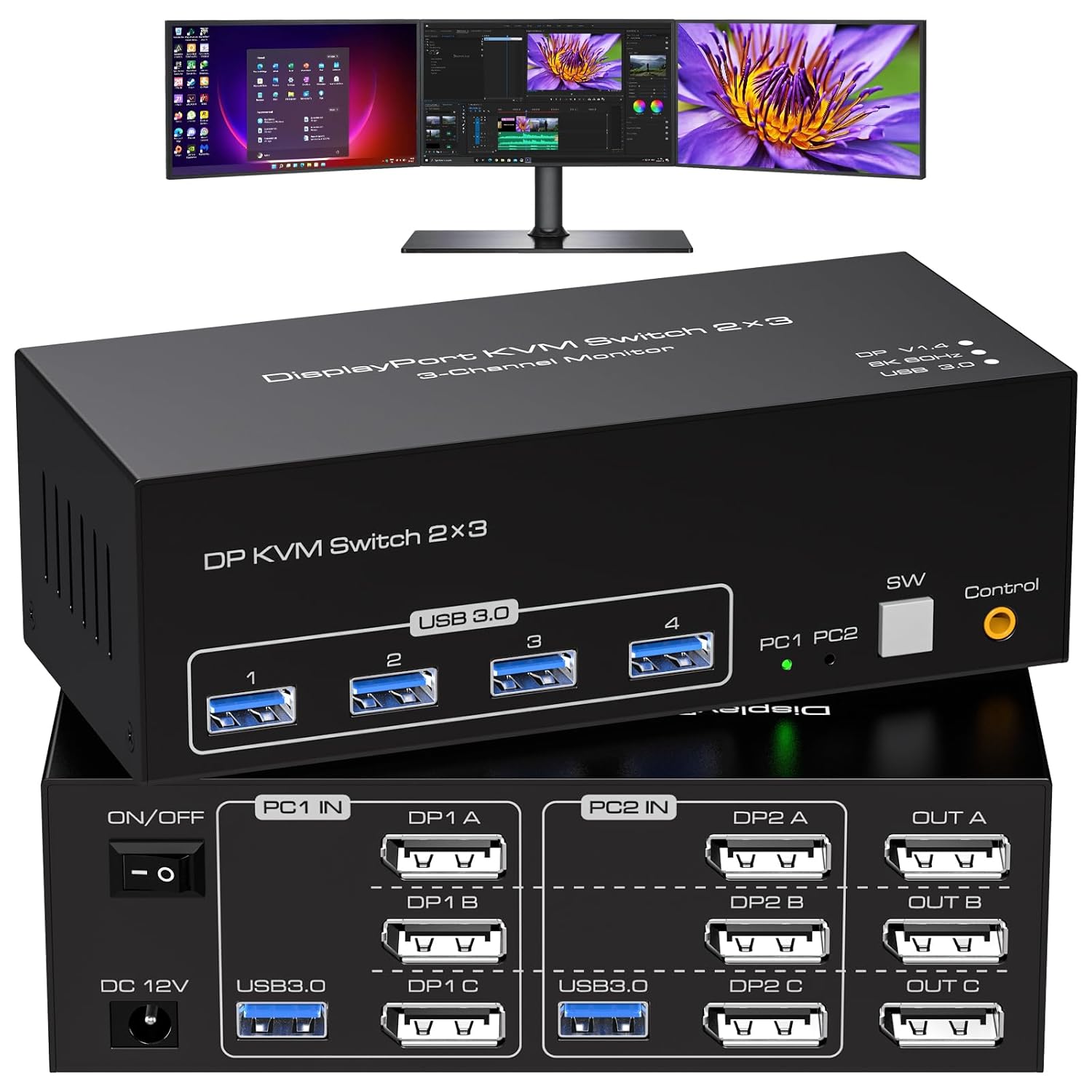 8K Displayport KVM Switch 3 Monitors 2 Computers 4K 120Hz DP KVM Switches Triple Monitor for 2 PC Share 4 USB 3.0 Ports Support Extended & Copy Display Mode Wired Controller and 12V Adapter