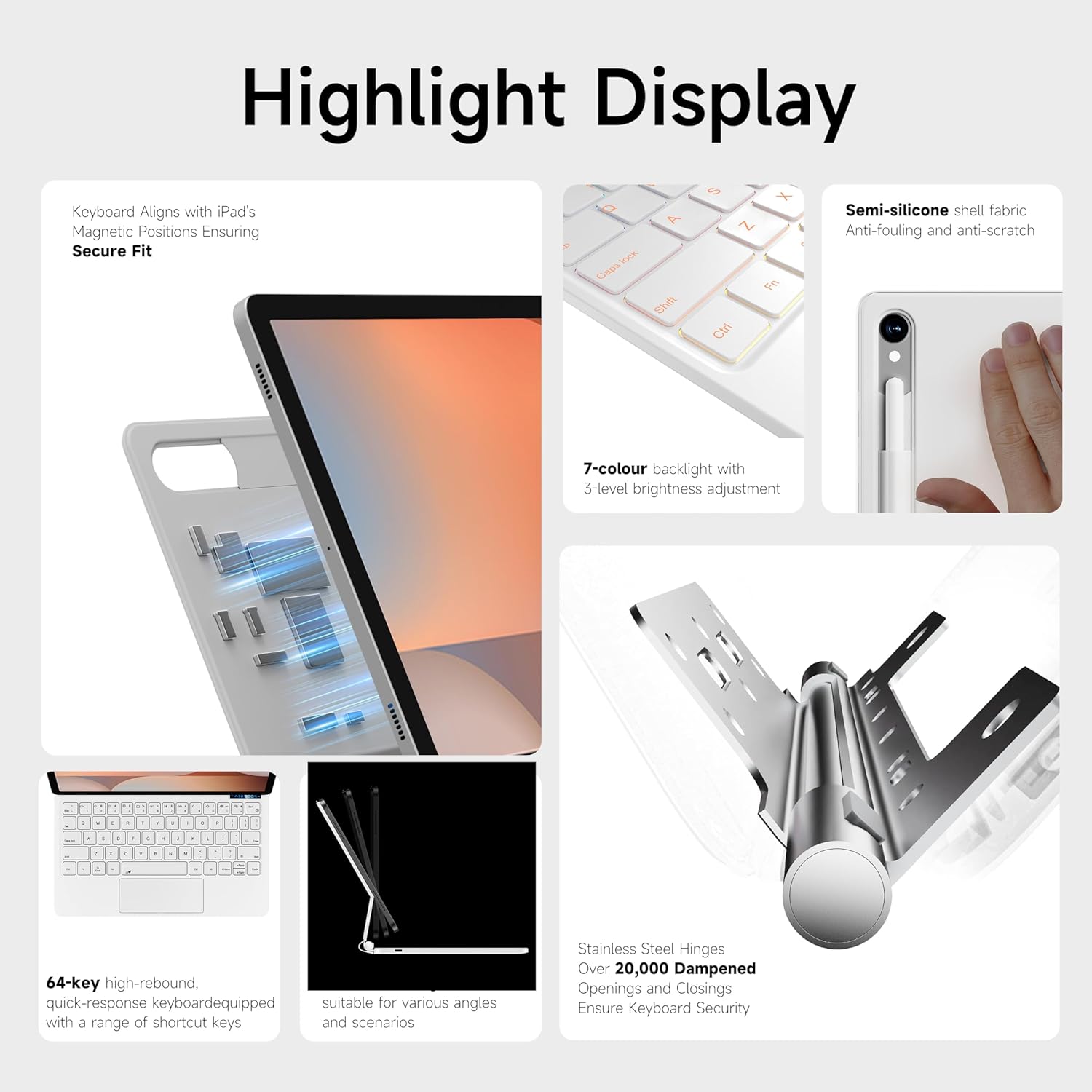 Keyboard Case for 12.4-inch Samsung Galaxy Tab S10+ Plus/S9+ Plus/S9 FE+ Plus/S8+ Plus/S7FE/S7+ Plus, 7 Colour Backlit, Multi-Touch Trackpad, Floating Magnetic Design, Battery Display, White