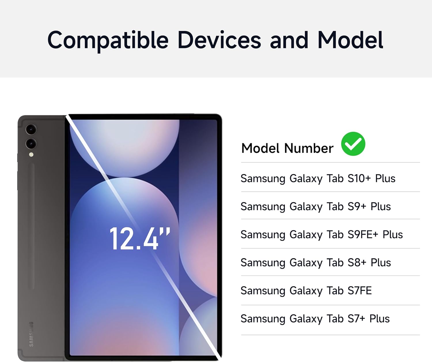 - Compatible Devices : 12.4-inch Samsung Galaxy Tab S10+ Plus/S9+ Plus/S9 FE+ Plus/S8+ Plus/S7FE/S7+ Plus