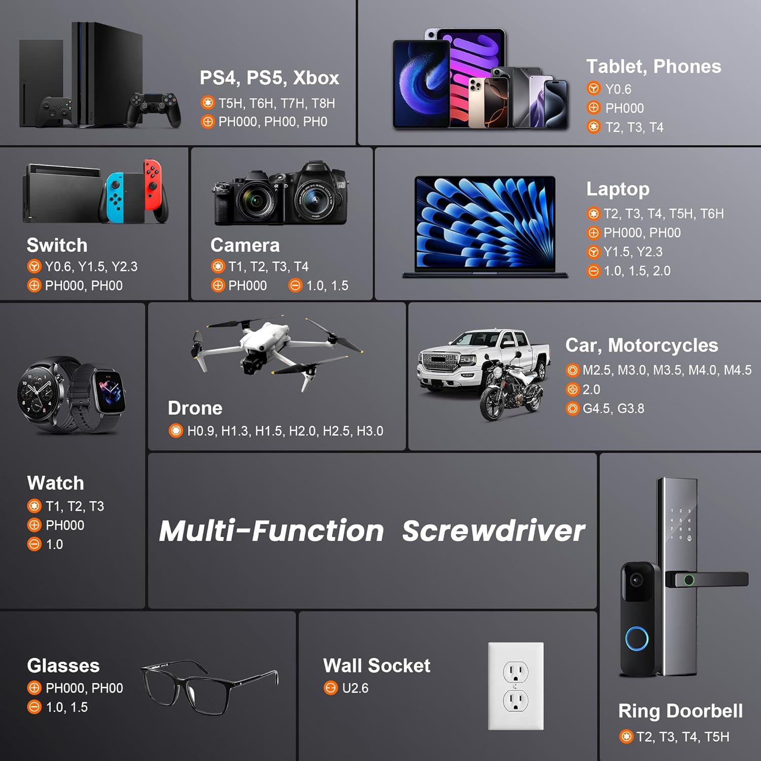 - Head Style : Torx, Security Torx, Phillips, Flathead, Triwing, Pentalobe, Triangle, H/U/G-type, MID, Cross