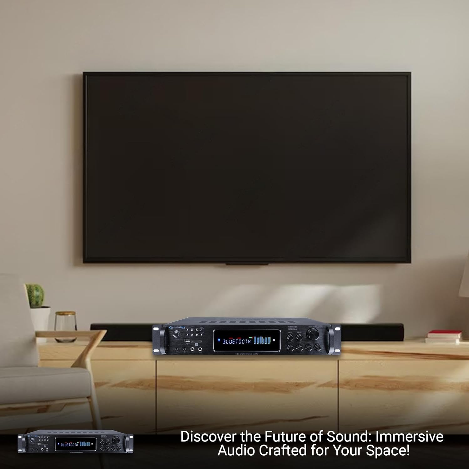 - HIGH-POWER AMPLIFIER WITH BLUETOOTH: Experience superior sound control with bass, treble, and balance adjustments, as well as dual mic inputs with echo controls. The FM digital tuner and 7.2 channel up conversion make this home audio receiver & amplifier perfect for home theater systems. Record .wav files directly onto USB or SD cards and enjoy random and repeat playback options, ensuring this audio receiver meets all your stereo system needs.