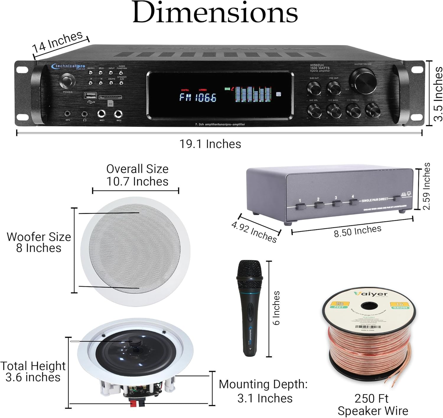 - BOOST YOUR HOME THEATER SOUND: Our all-in-one audio kit is perfect for creating or upgrading your home theater systems. Featuring easy installation, it includes a powerful home theater receiver, premium ceiling speakers, 4-Ch Speaker Selector, durable speaker wire & professional wired mic. Whether you’re looking for a new home stereo system or a home audio system with speakers, this kit provides excellent sound quality and seamless setup.