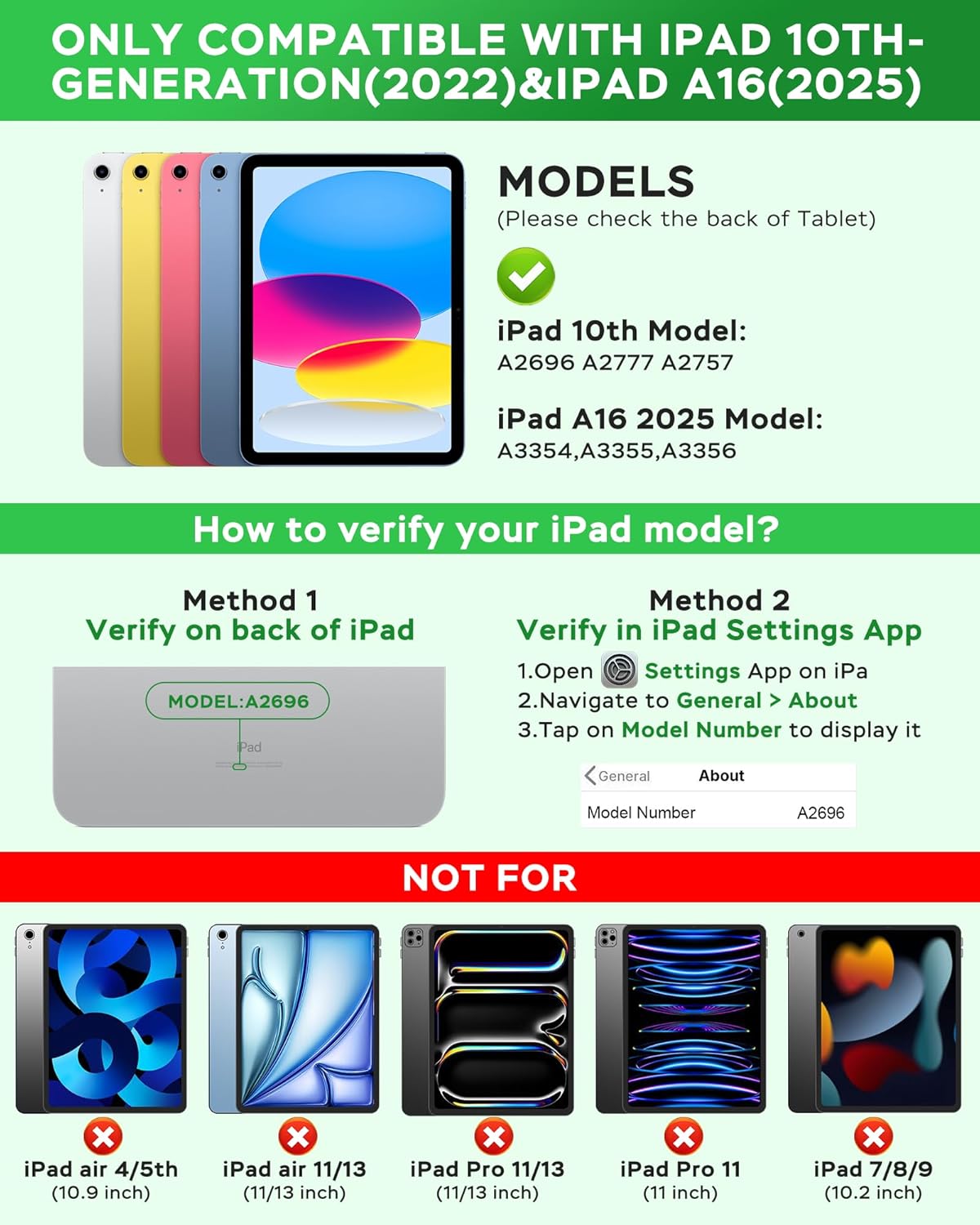 - Compatibility: Designed for iPad 10th Generation (2022) 10.9-inch (Models: A2696, A2757, A2777) and iPad A16 (2025). Not compatible with other iPad models. Please check the model number on the back of your iPad to ensure a perfect fit