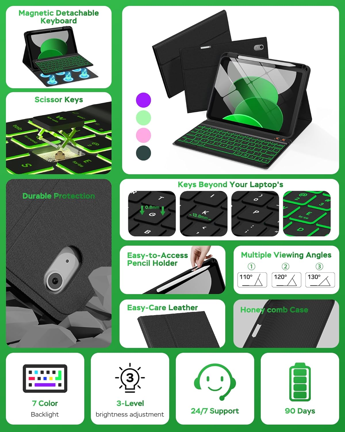 - Illuminate Your Typing: Enhance your iPad with a 7-color backlit keyboard and laser-etched keys. Perfect for any lighting, from late-night work to cozy cafés. Enjoy quiet, comfortable typing with customizable backlighting and ergonomic scissor-switch keys