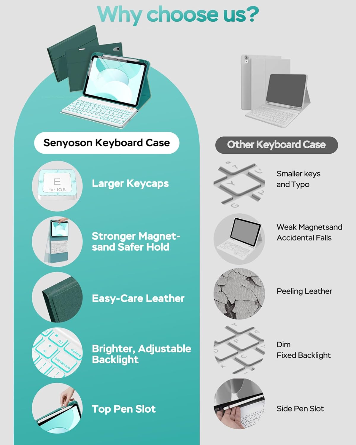 - Illuminate Your Typing: Enhance your iPad with a 7-color backlit keyboard and laser-etched keys. Perfect for any lighting, from late-night work to cozy cafés. Enjoy quiet, comfortable typing with customizable backlighting and ergonomic scissor-switch keys