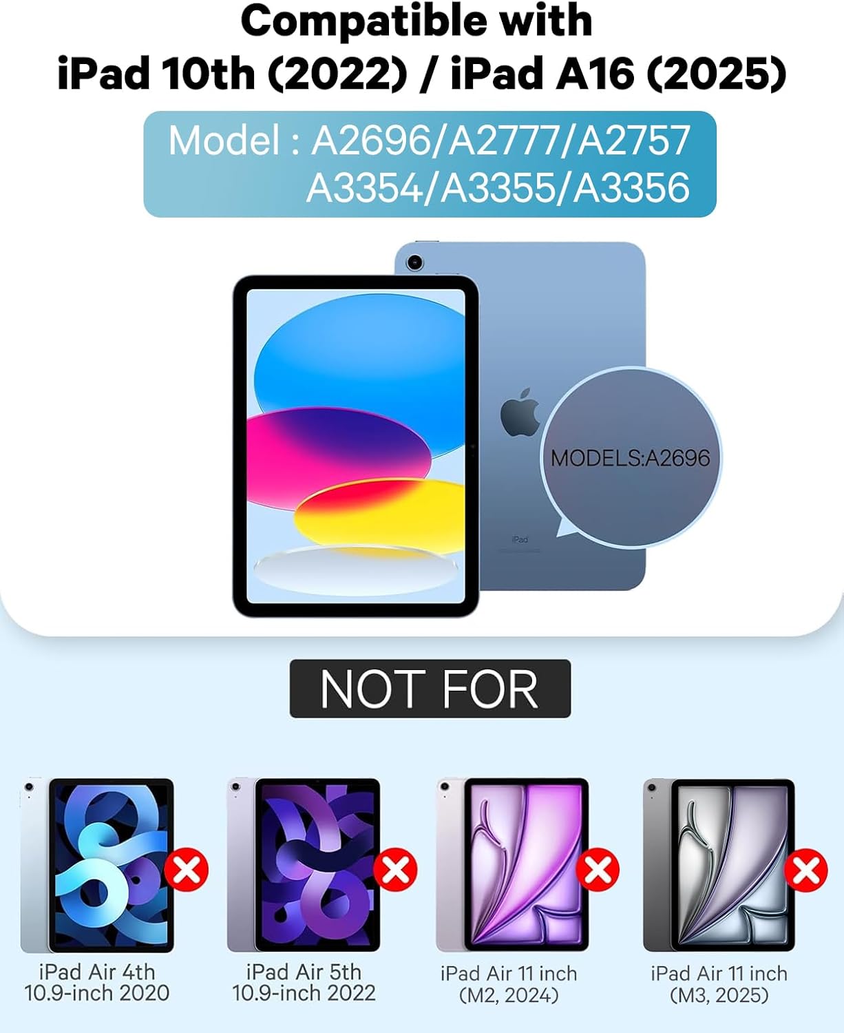 - 【Compatibility】 This wireless keyboard case is compatible with New iPad (A16) 11th Gen 11-inch 2025 (Models: A3354/A3355/A3356) and iPad 10th Gen 10.9 inch 2022 (Model Number: A2696/A2757/A2777). Please verify your tablet model carefully before purchasing. (iPad and pen not included)