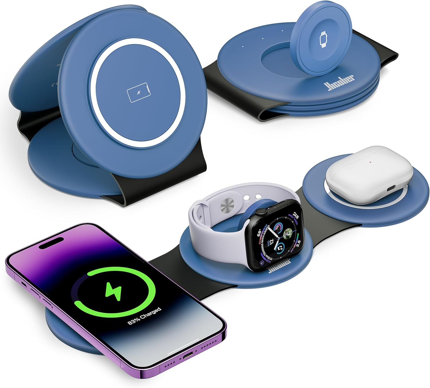 Hicober 3 in 1 Charging Station for Apple Multiple Devices, Foldable Travel Wireless Charger 18W for iPhone 16 15 14 13 Pro Max Plus &Apple Watch Series/Airpods Light Blue