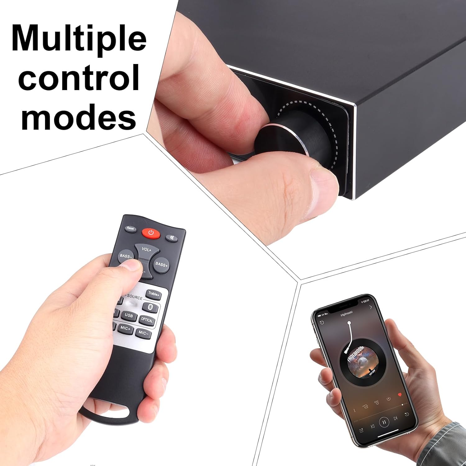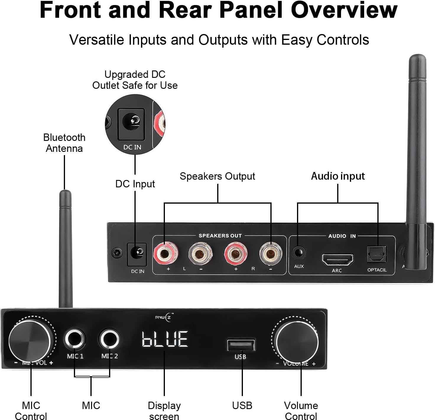 - 2. Versatile Connectivity + Pro-Grade Microphone Support: As a multi-functional Bluetooth Amplifier, it features HDMI/Optical/USB/AUX inputs for seamless integration with TVs, gaming consoles, PCs, and more. Dual independent microphone ports enable duet singing, meetings, or live streaming, while dedicated volume knobs for mics and master output eliminate feedback and ensure crystal-clear vocals—perfect for creating professional karaoke setups or conference systems.