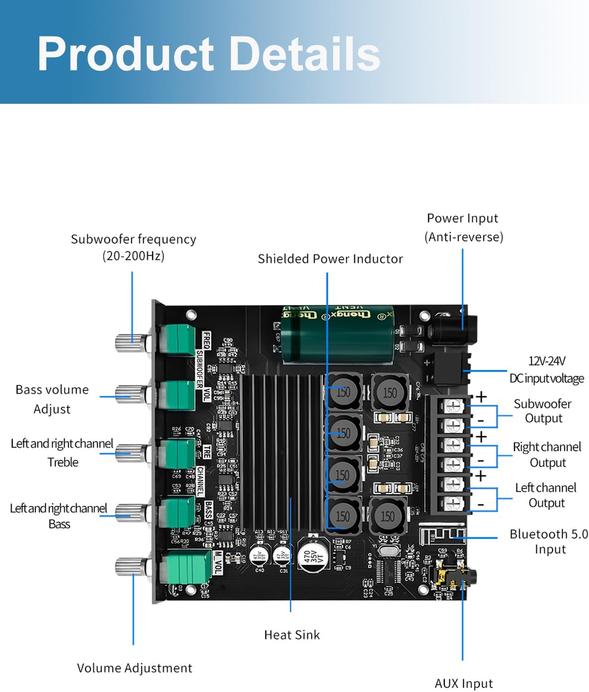 - Bluetooth+AUX Input:50W+50W+100W Bluetooth 5.0 Audio Amplifier Board, Bluetooth+AUX audio dual input, 2.1 channel stereo output, with AM interference suppression function. Note: When using AUX mode, please confirm that the Bluetooth connection of this module has been disconnected