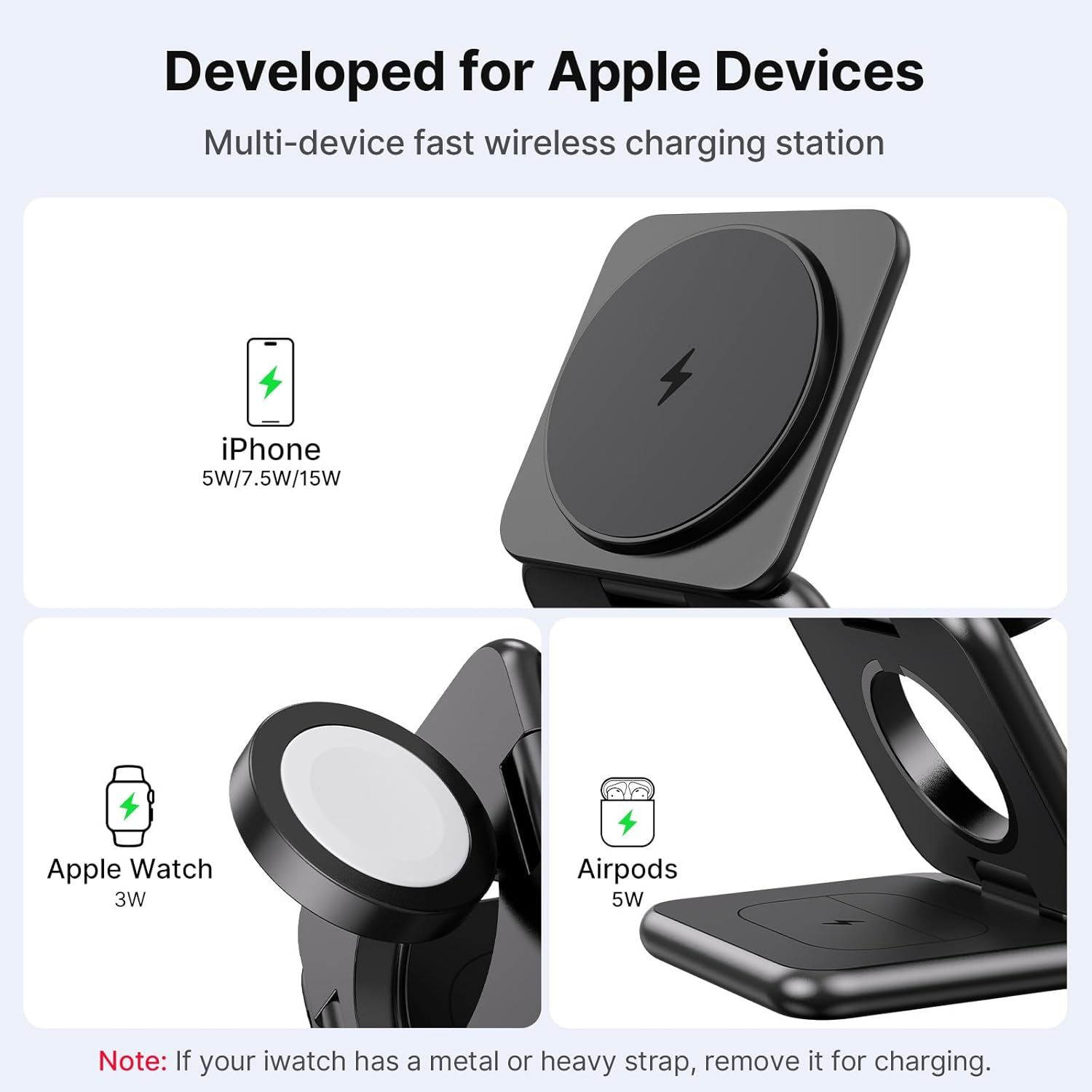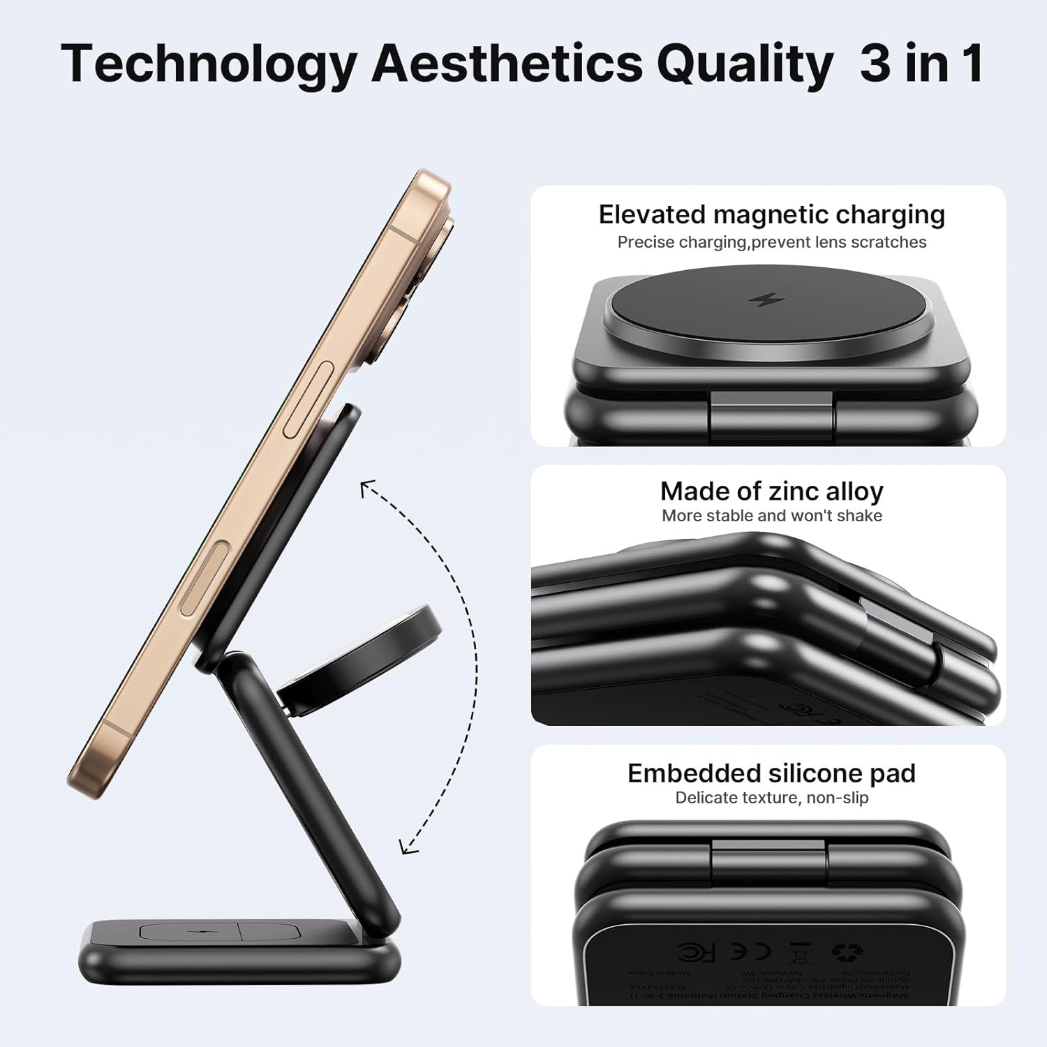 3 in 1 Charging Station for Apple Multiple Devices, Zinc Alloy Foldable Travel Wireless Charging pad for Mag-Safe Wireless Charger Stand for iPhone 16 15 14 13 12 Apple Watch Airpods