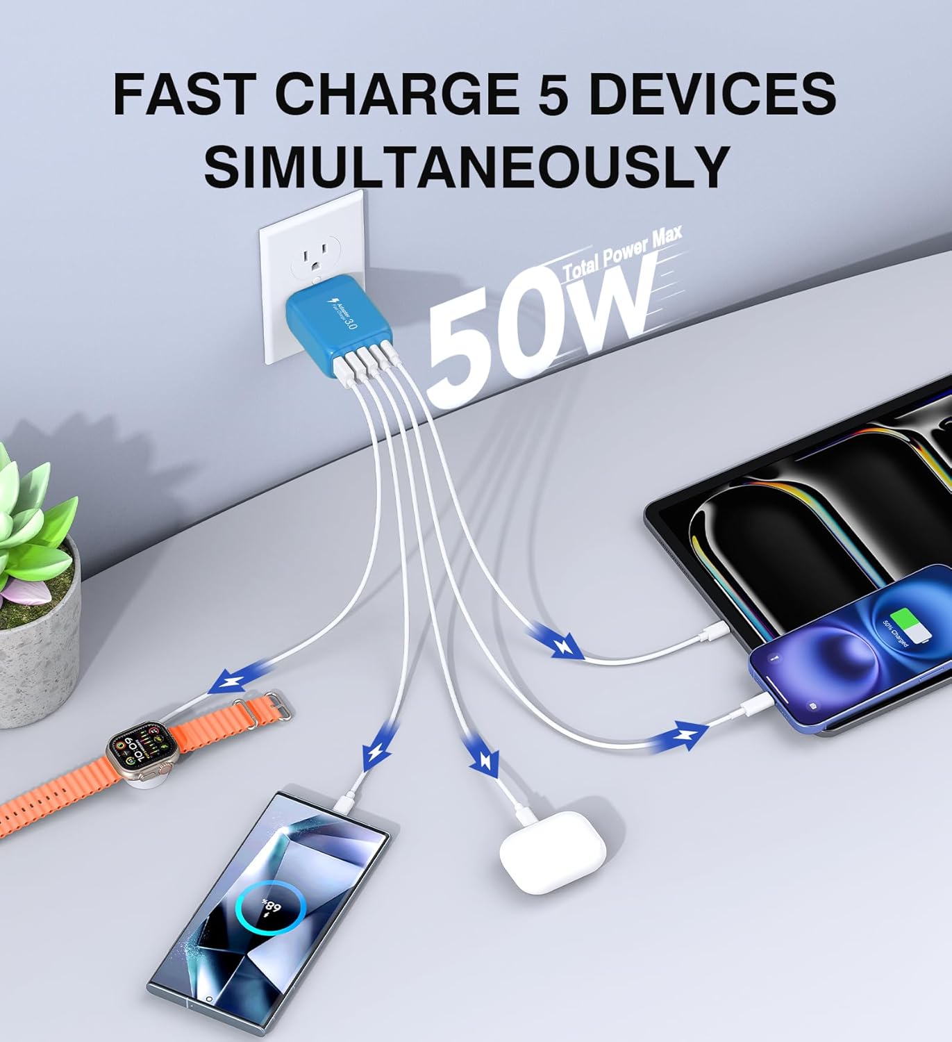 2-Pack USB C Wall Charger Block,50W 5-Port C Charger Fast Charging Block PD Power Adapter +QC 3.0 Multiport Type C Box Charger Cube USB A Wall Plug for iPhone 16/15/14/13 Pro Max,Samsung Galaxy(Blue)