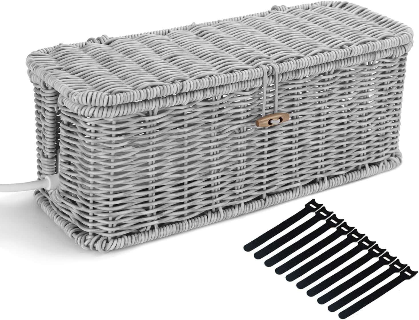 Cable Management Box, Woven Rattan Cord Hider With Lid & Button Lock, Floor Cord Holder for Power Strip USB Hub, Boho Desk Wicker Wires Storage Cable Organizer Box(grey)