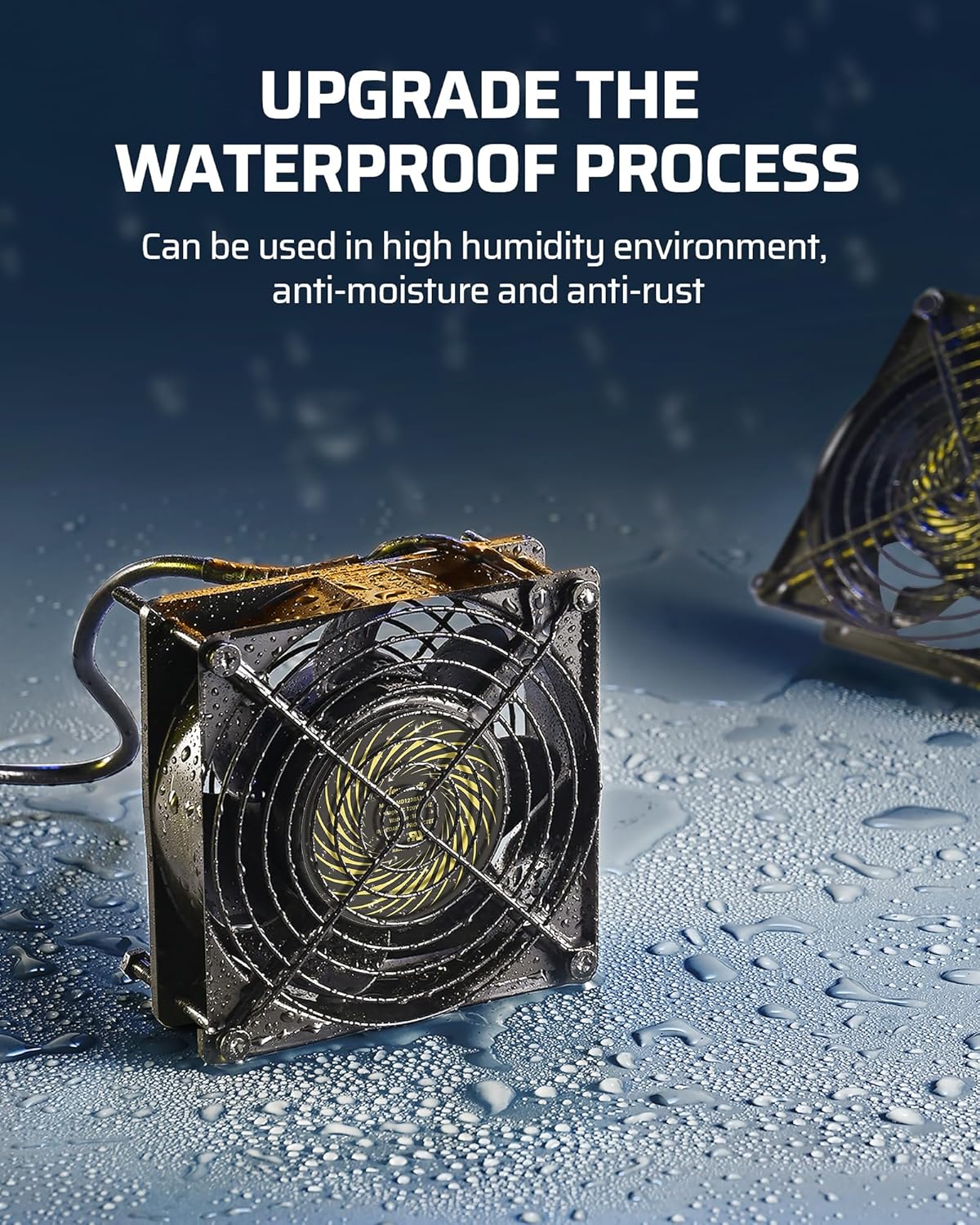 - [Upgraded Waterproofing] Designed to perform in high-humidity environments, the 120mm fan’s body is rust-proof and waterproof; ideal product for use in greenhouses, grow rooms, chicken coops, garages, and other moist settings