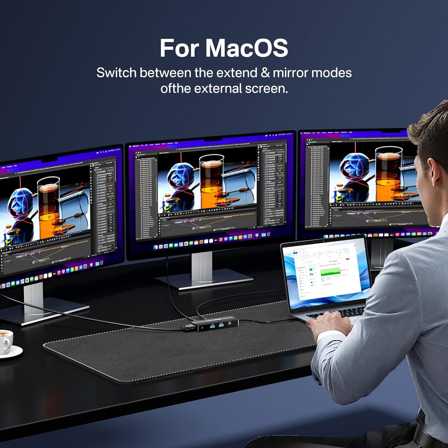 - [Docking Station Dual Monitor] The laptop docking station has 3 video output ports: 2 HDMI+VGA ports for up to 4K dual/triple monitor video output; if the VGA port is connected, it will affect the resolution of all the monitors, up to 1080P only! Please note: Only Windows OS can expand 3 monitors (MST support), MacOS does not support MST!