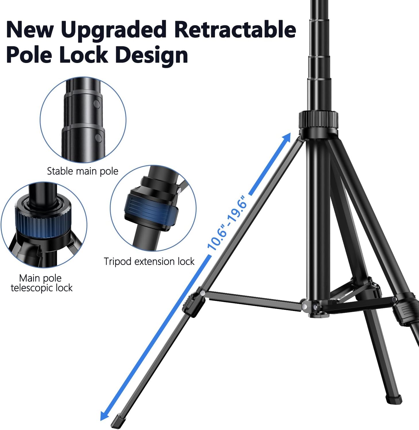 - 【3-in-1 Selfie Stick Tripod with Light and Lock】 This auto face tracking tripod 360° rotation with stand has a foldable and retractable function and can be used as a desk or floor tripod/selfie stick with light. The tripod's main pole has a lock and can be adjusted from 15.7″ to 70.9″. The bottom pole also has a lock and can be extended up to 8.6″ to meet your various needs. There is a storage bag in the package for your convenience when traveling outdoors