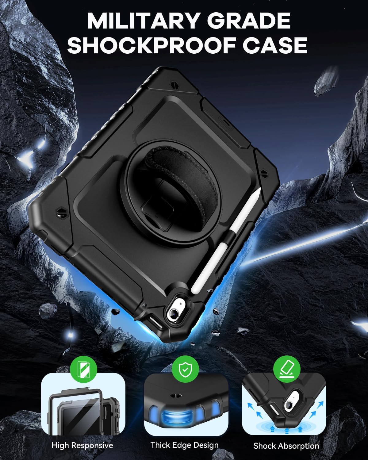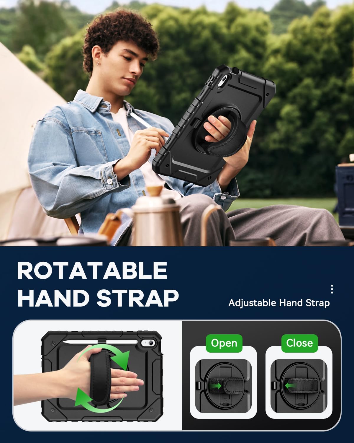- With Shoulder/Hand Strap & Rotating Stand: The ipad 10th case with portable shoulder/hand strap makes your tablet more conveniently outdoors & indoors, such as display your iPad behind car head rest. 360 degree rotating kickstand provides different typing & viewing angles for studying, gaming, watching video, etc.